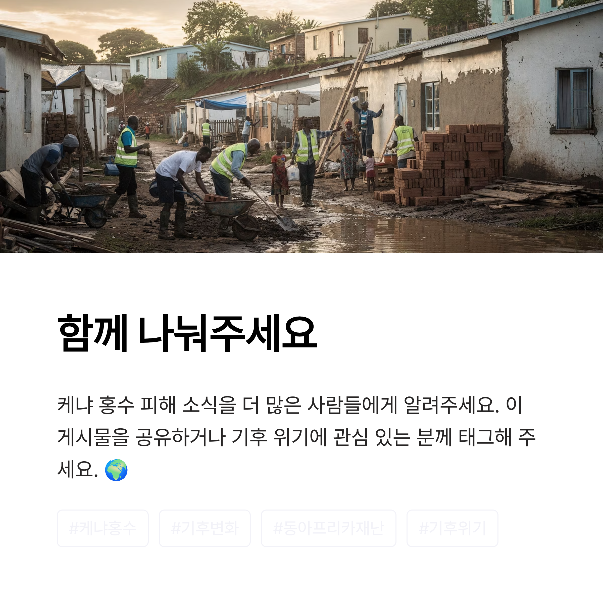 최근 케냐 전역에서 발생한 대규모 홍수로 인한 사망자가 108명에 달하며, 재난의 심각성이 커지고 있습니다. 지속적인 폭우와 범람한 배수 시스템은 추가 피해를 초래할 가능성을 높이고 있으며, 수천 명의 이재민이 발생한 상황입니다. 당국과 국제기구는 이번 사태를 기후 변화로 인한 극단적 기상 현상의 대표적 사례로 보고 있습니다.