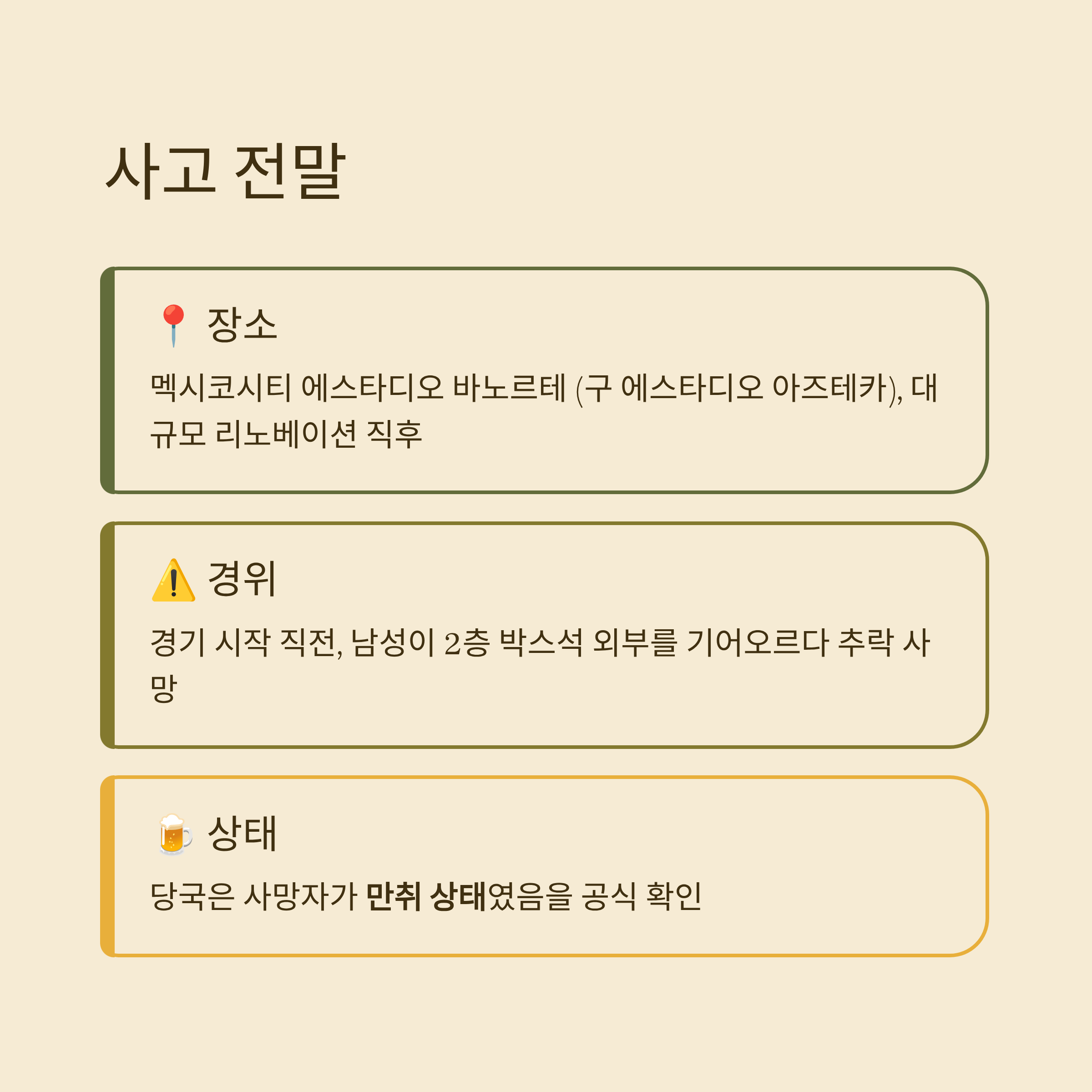 이번 사고는 멕시코시티에 위치한 Estadio Banorte에서 발생했습니다. 해당 경기장은 과거 Estadio Azteca라는 이름으로 더 잘 알려져 있으며, 대규모 리노베이션을 거쳐 새 단장을 마친 직후였습니다.