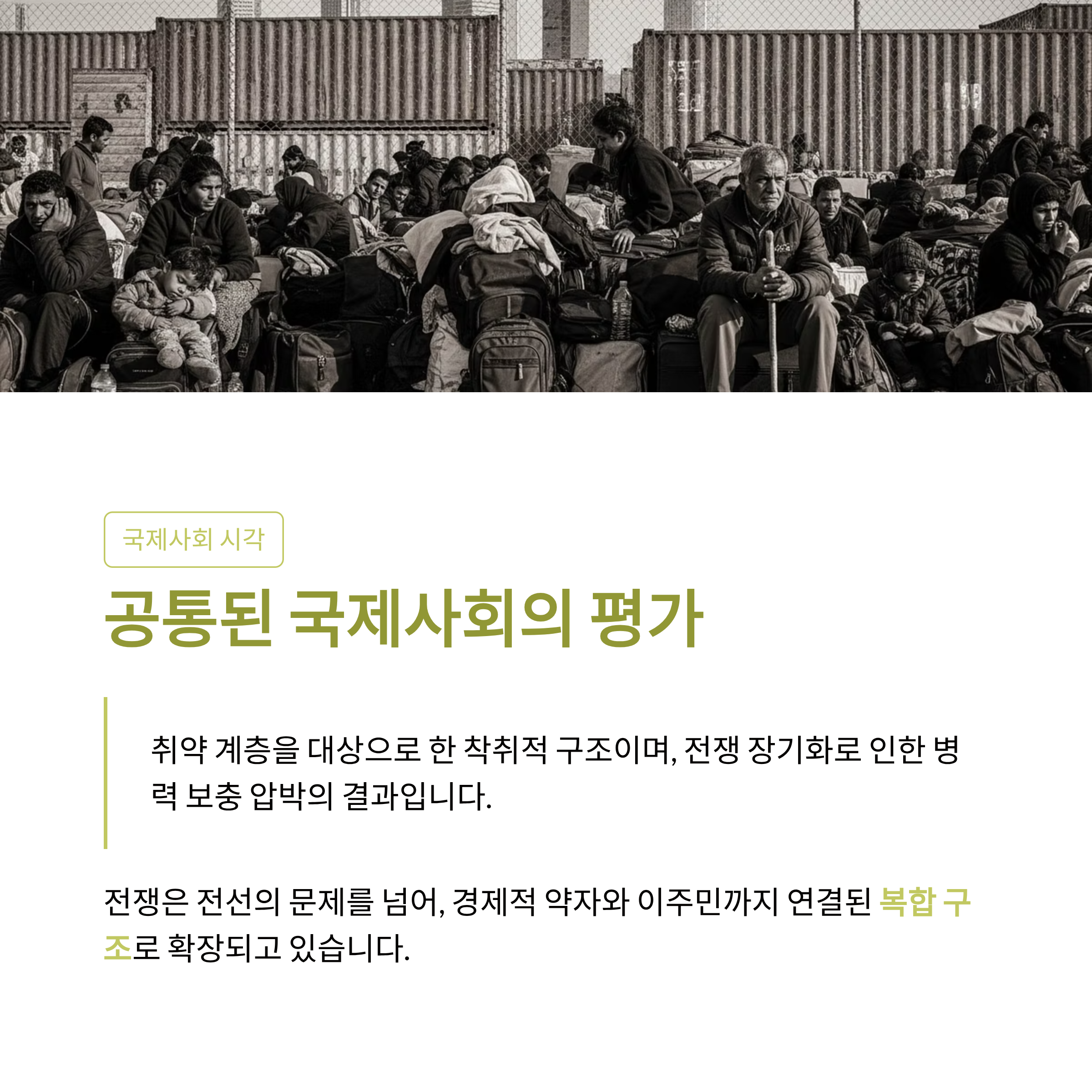 전쟁은 단순한 전선의 문제가 아니라, 경제적 약자와 이주민까지 깊게 연결된 복합 구조로 확장되고 있다는 사실을 다시 한번 보여주는 사례입니다.