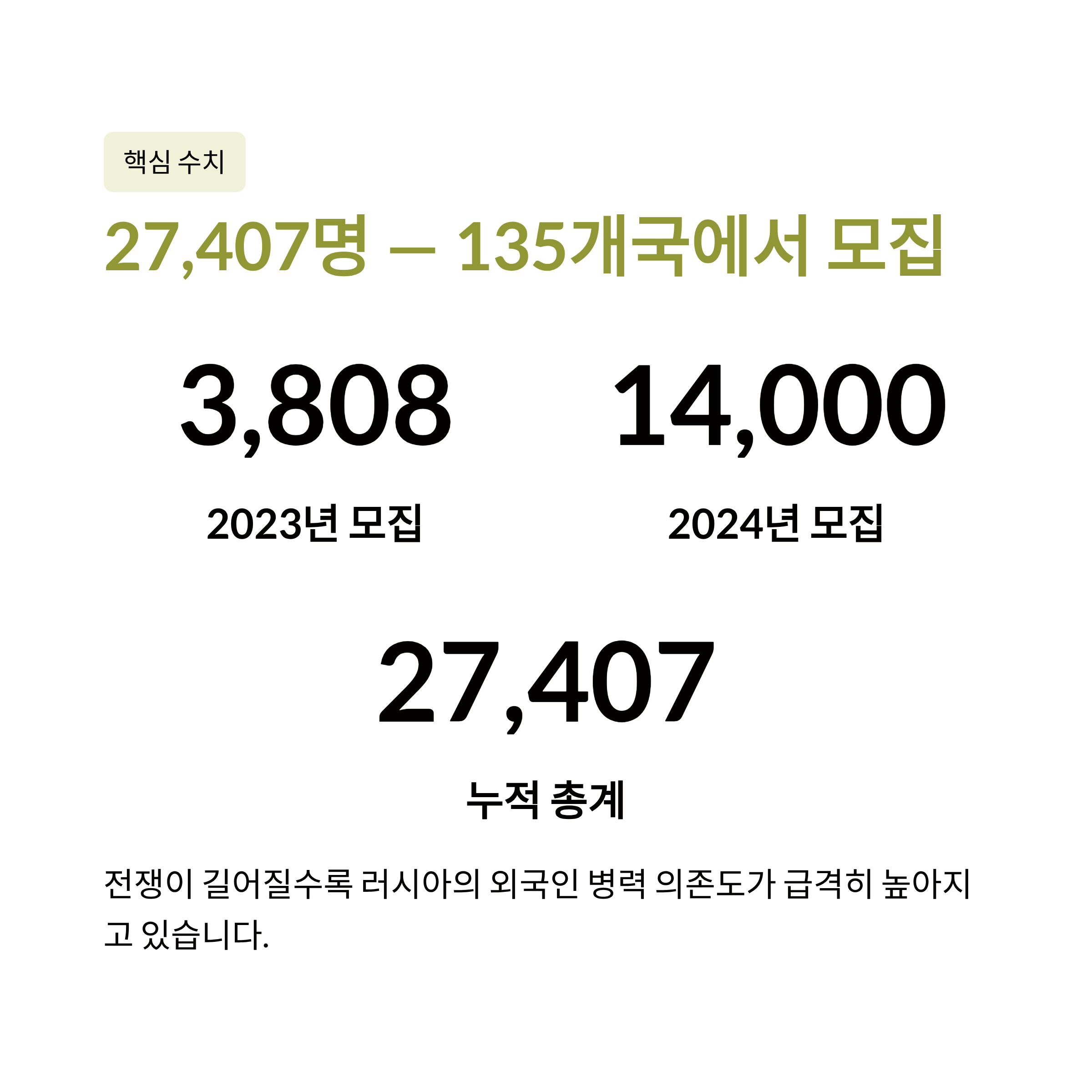 병력 공백을 빠르게 메우기 위해 해외 모집 네트워크를 확장하고 있다는 점이 여러 매체에서 공통적으로 지적됩니다.