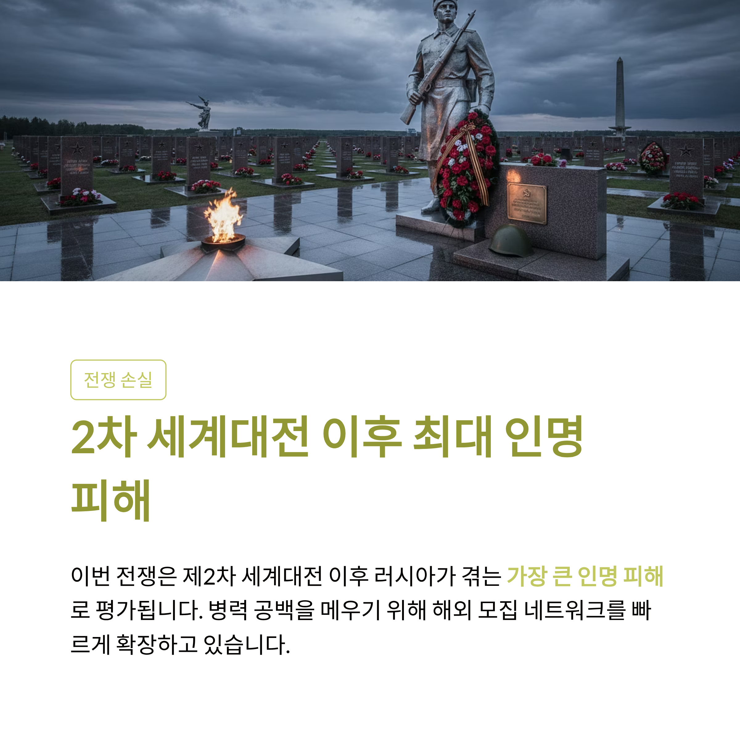 이번 외국인 모집 확대는 전쟁 손실과 직결되어 있다는 분석이 나옵니다. 이번 전쟁은 제2차 세계대전 이후 러시아가 겪는 가장 큰 인명 피해로 평가되고 있습니다.