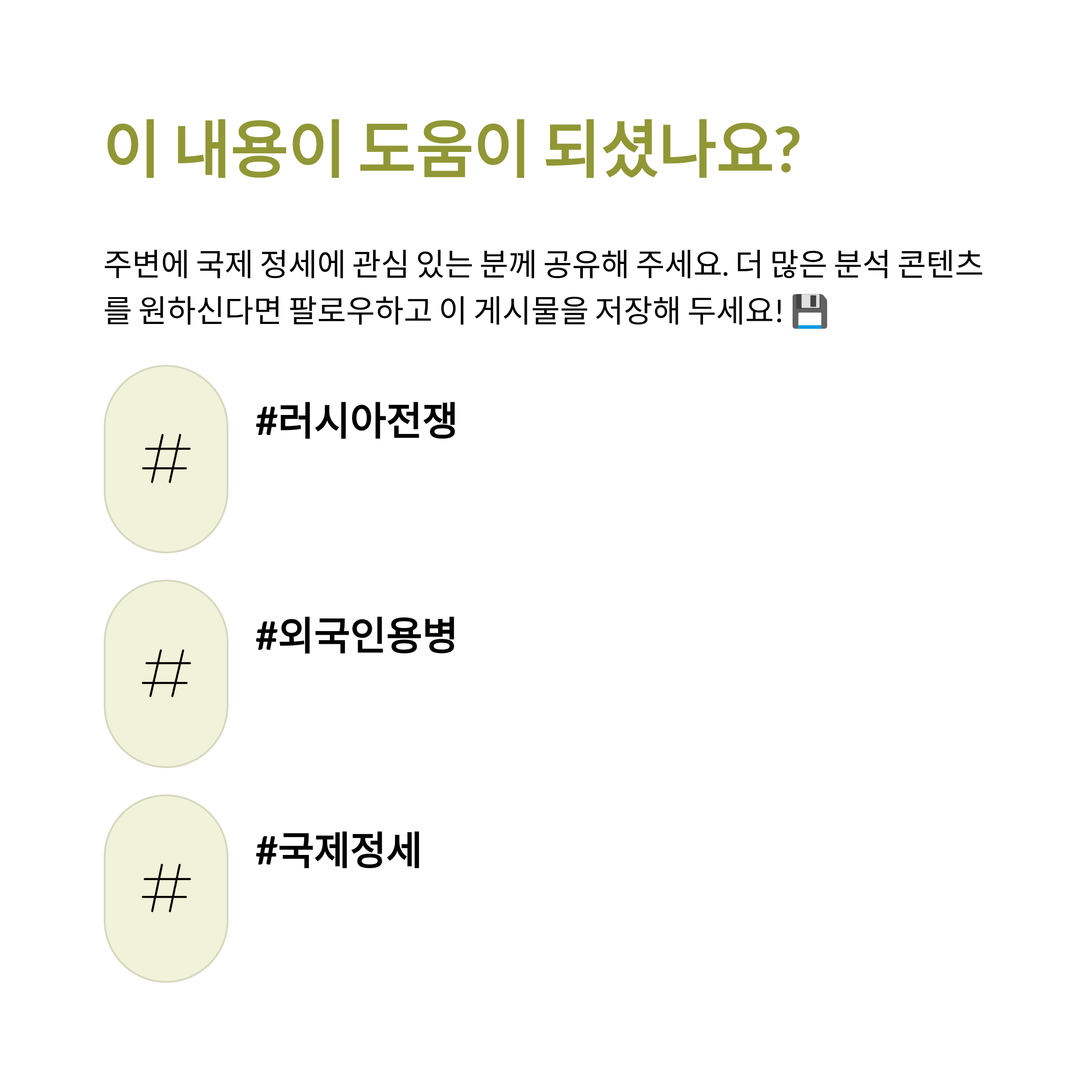 정치적 입장과 무관하게 여러 매체는 공통적으로 러시아의 외국인 모집 방식이 취약 계층을 대상으로 한 착취적 구조라는 점에 주목하고 있습니다. 동시에 이는 전쟁 장기화로 인한 병력 보충 압박의 결과라는 점에서도 의견이 모이고 있습니다.