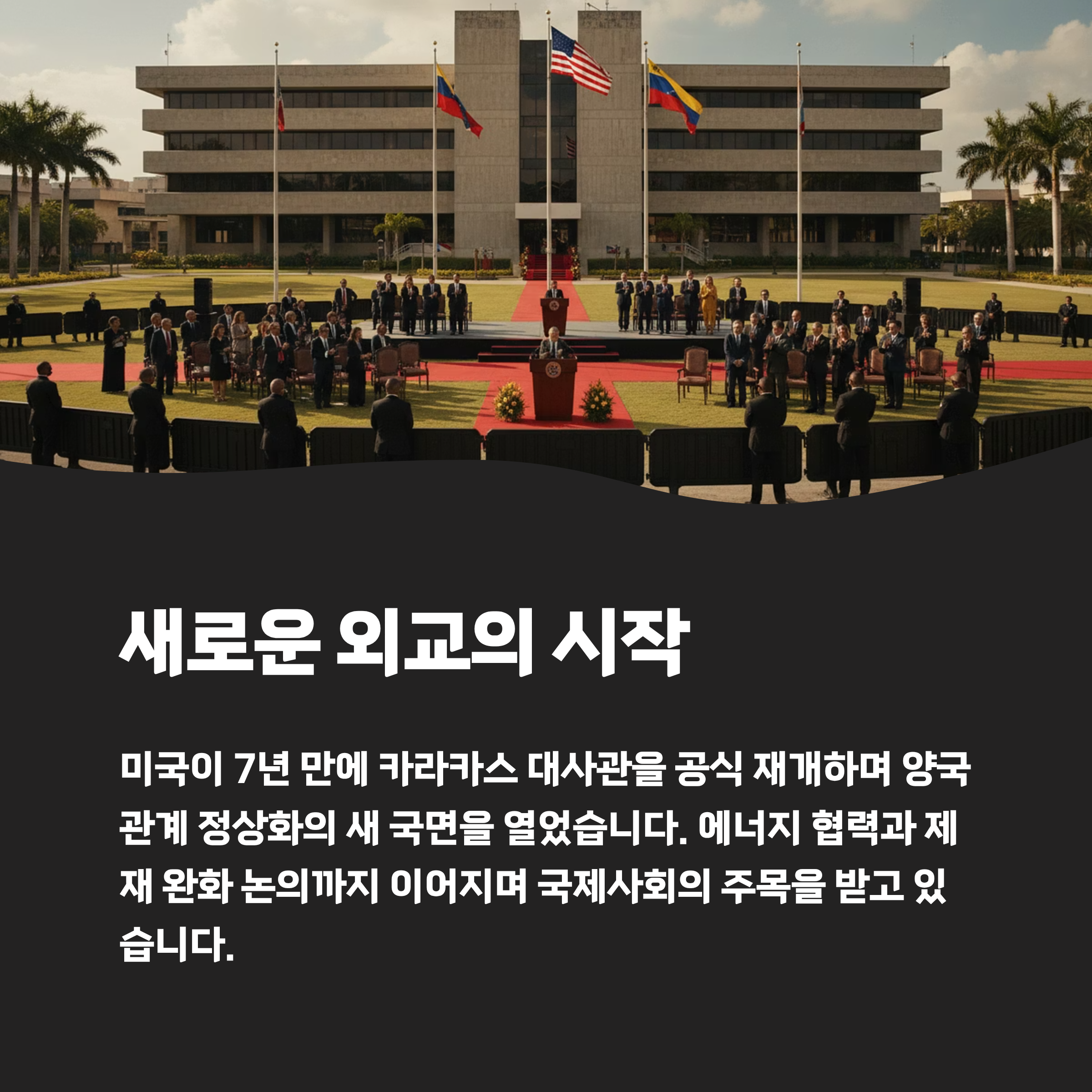 미국이 7년 만에 베네수엘라 카라카스 주재 대사관을 공식적으로 재개하며 양국 관계 정상화의 새로운 국면을 열었습니다. 이번 조치는 외교 단절 이후 이어진 긴장 국면을 완화하고 정치·경제 협력의 토대를 마련하는 중요한 전환점으로 평가됩니다. 국제 정세 속에서 에너지 협력과 제재 완화 논의까지 이어지며 그 의미가 더욱 주목받고 있습니다.