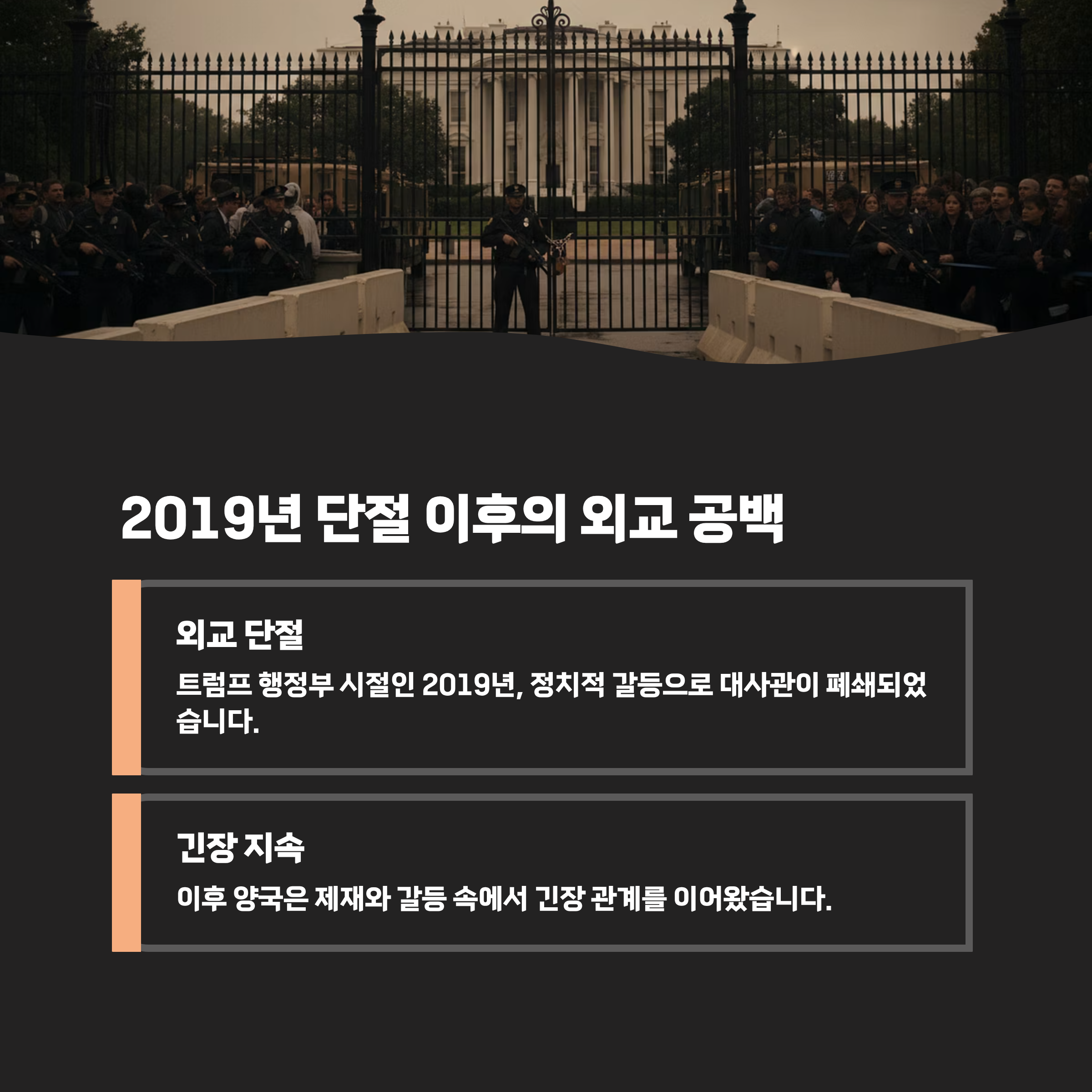Donald Trump 행정부 시절인 2019년 외교 관계가 단절되며 대사관이 폐쇄되었습니다. 이후 양국은 정치적 갈등과 제재 속에서 긴장 관계를 이어왔습니다.