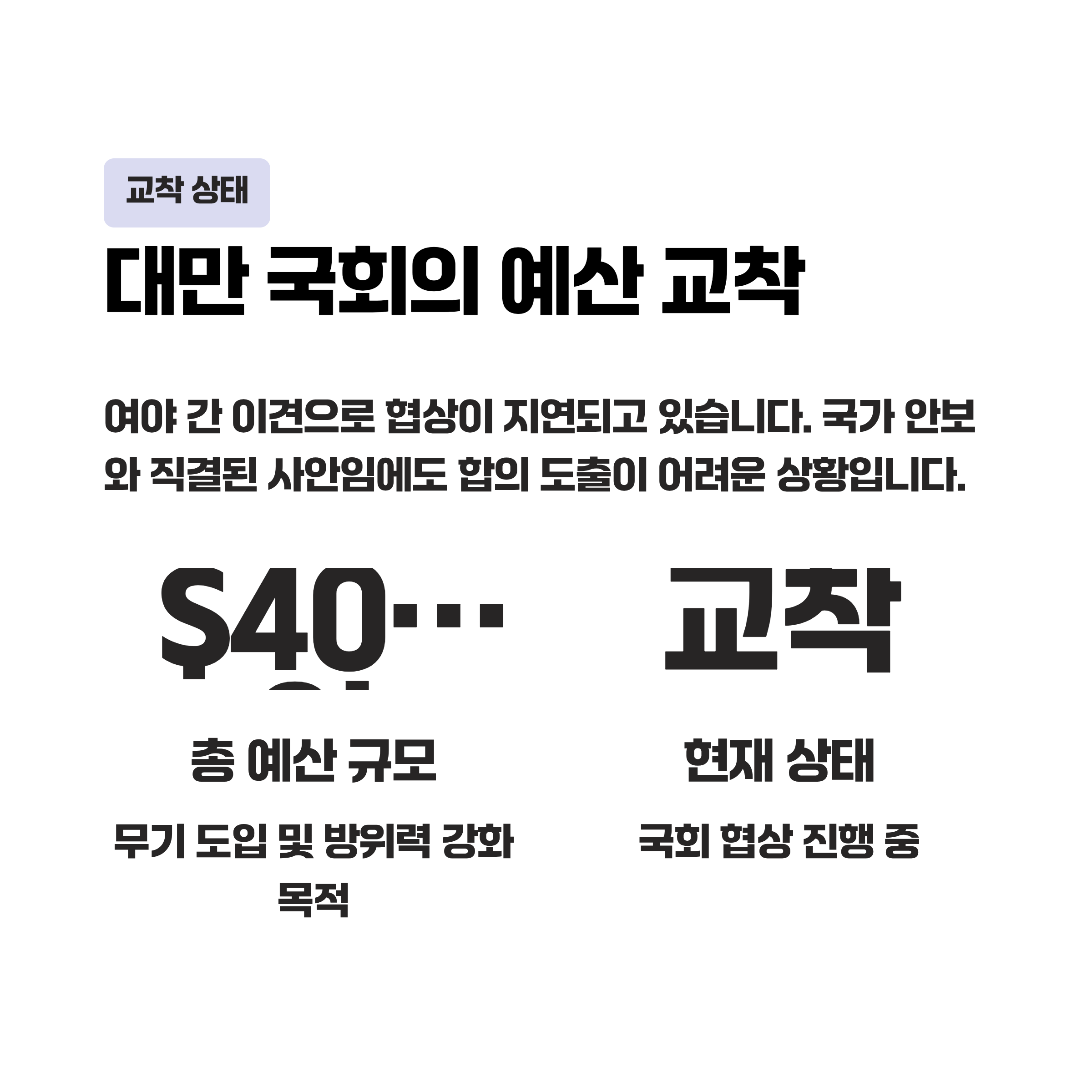 Taipei를 중심으로 한 대만의 방위 정책은 역내 안보 균형에 직접적인 영향을 미칩니다. 국방 예산 지연은 미국의 무기 인도 일정과 방어 체계 구축에 차질을 초래할 가능성이 있습니다.