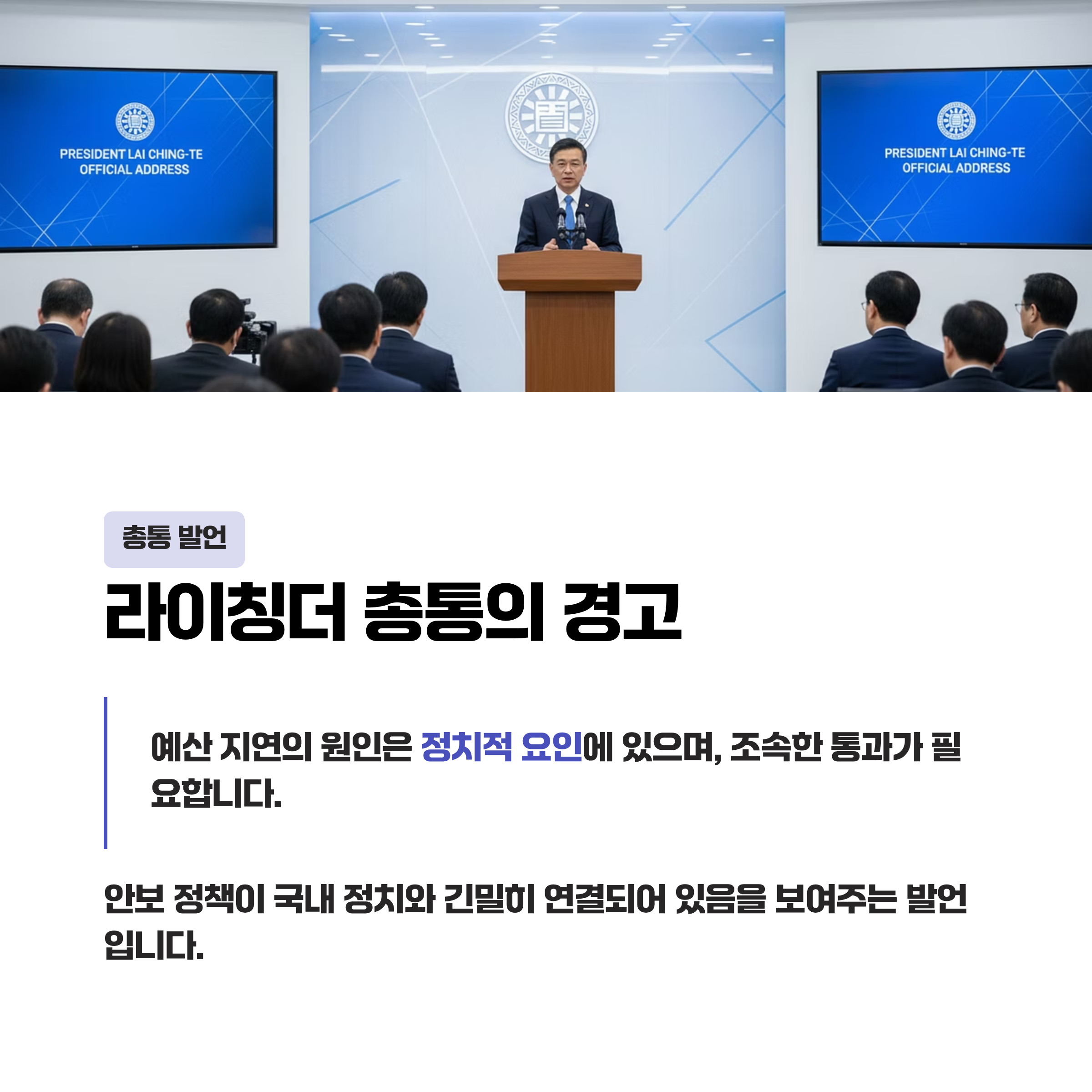 대만의 Lai Ching-te 총통은 예산 지연의 원인으로 정치적 요인을 지목하며 조속한 통과의 필요성을 강조했습니다. 이는 안보 정책이 국내 정치와 긴밀히 연결되어 있음을 보여줍니다.