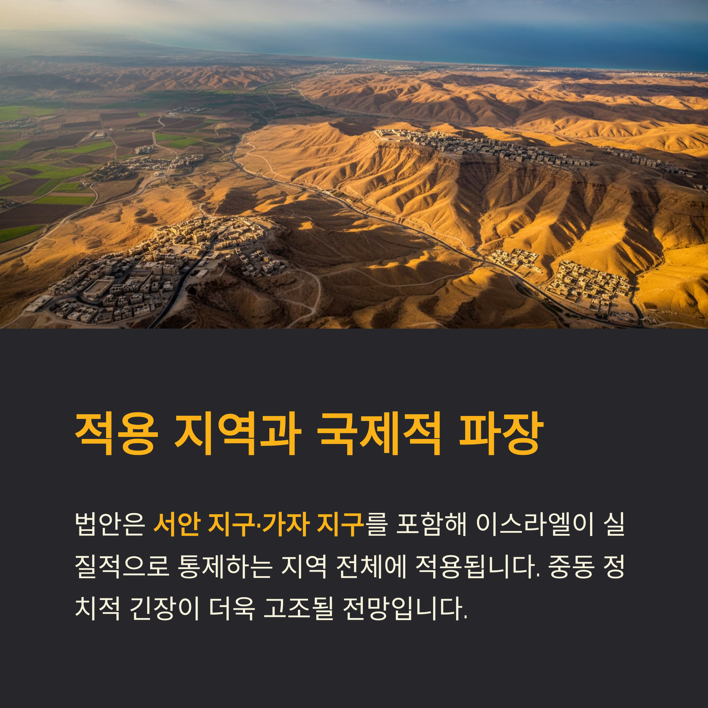 이번 법안은 서안 지구와 가자 지구를 포함해 이스라엘이 실질적으로 통제하는 지역에 적용됩니다. 이에 따라 중동 지역의 정치적 긴장이 더욱 고조될 가능성이 제기되고 있습니다.