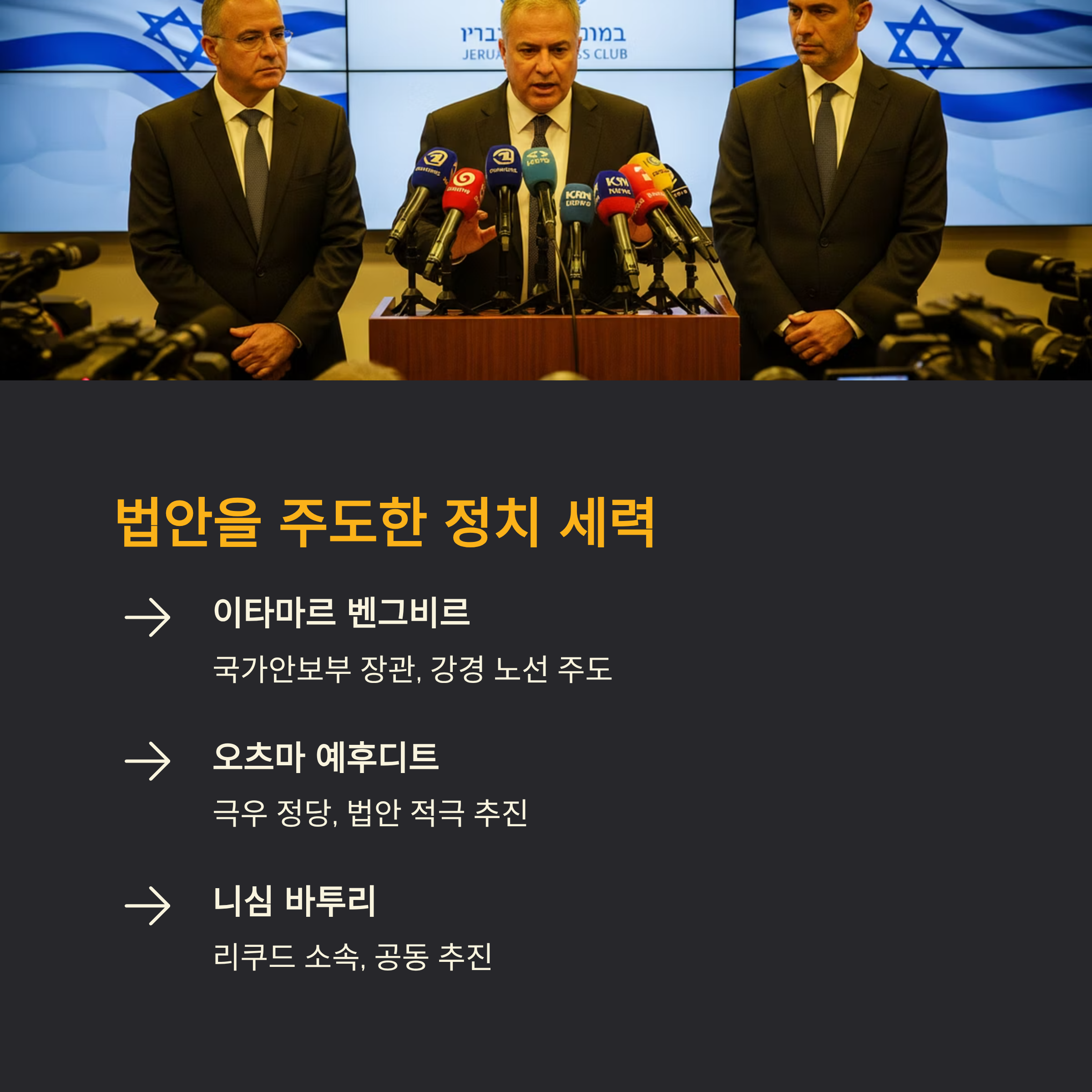 국가안보부 장관인 이타마르 벤그비르와 극우 정당 오츠마 예후디트, 그리고 리쿠드의 니심 바투리가 법안을 적극 추진하며 강경 노선을 강화했습니다.