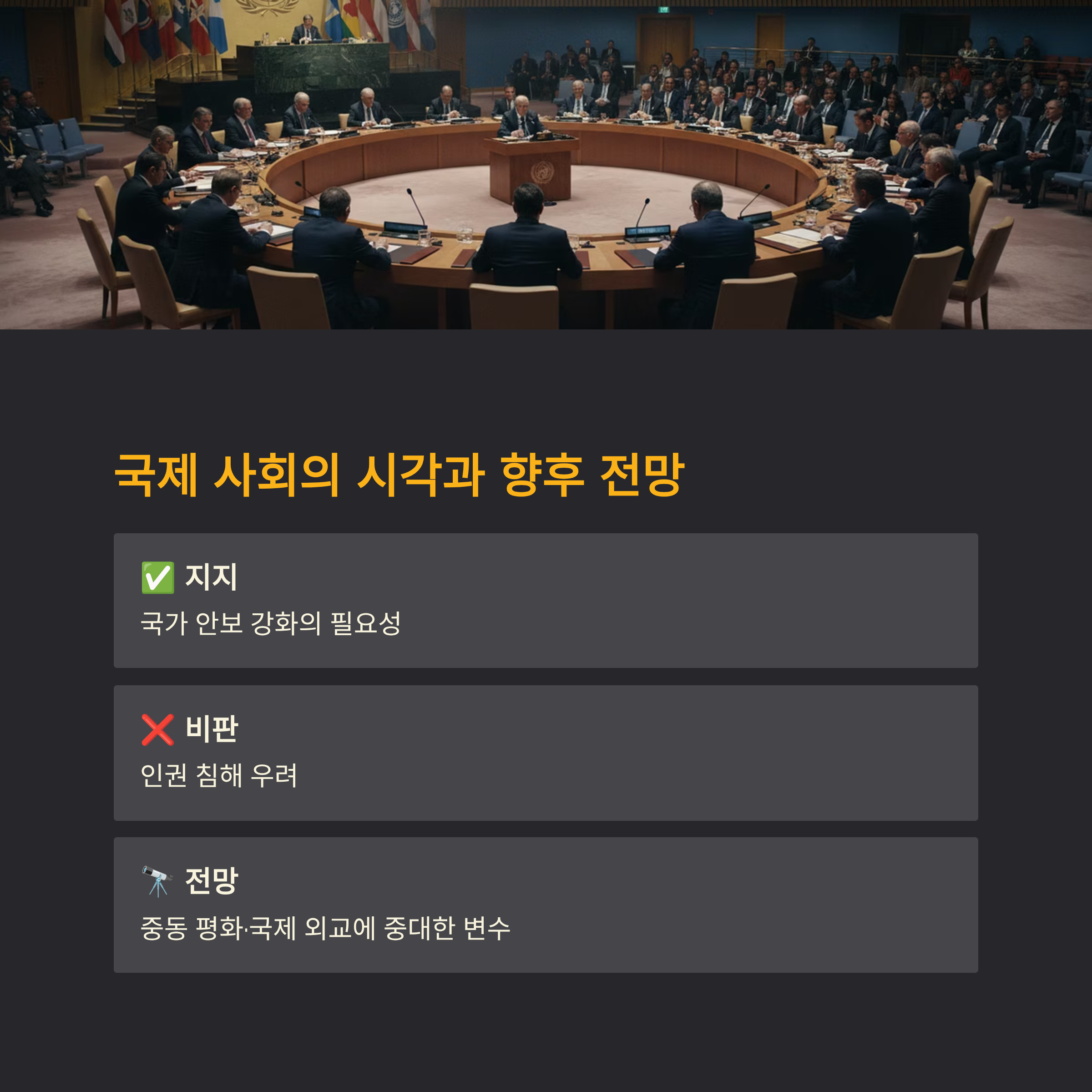 이번 법안은 안보 강화라는 지지와 인권 침해라는 비판을 동시에 받고 있습니다. 중동 평화와 국제 외교 관계에 미칠 영향이 주목되는 가운데, 향후 정책 변화와 국제 반응이 중요한 변수로 작용할 전망입니다.
