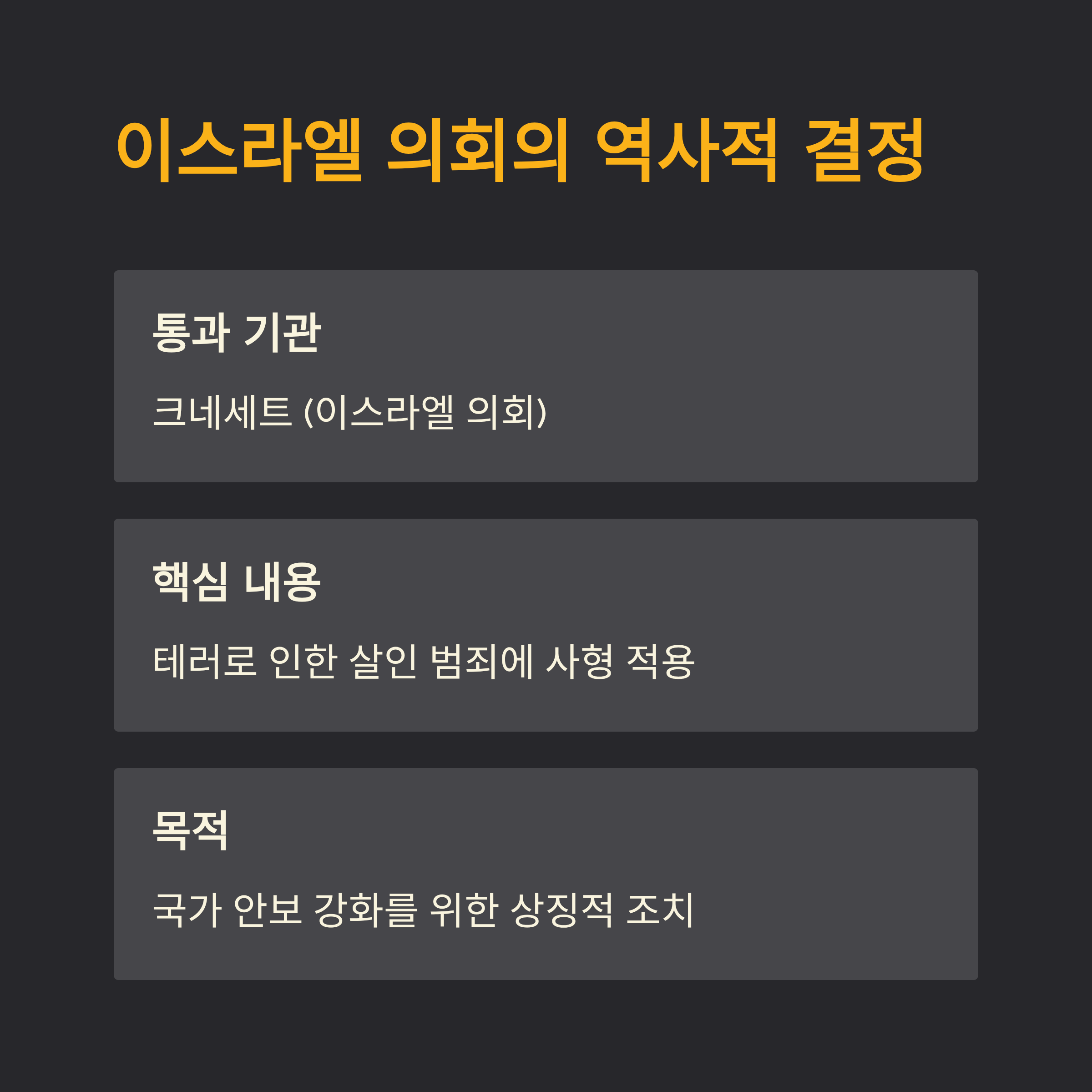 크네세트가 월요일 사형제를 기본 형량으로 하는 법안을 통과시키며 강력한 대테러 정책을 공식화했습니다. 이 법은 이스라엘인을 살해한 팔레스타인인에게 적용되며, 국가 안보 강화를 위한 상징적인 조치로 평가받고 있습니다.