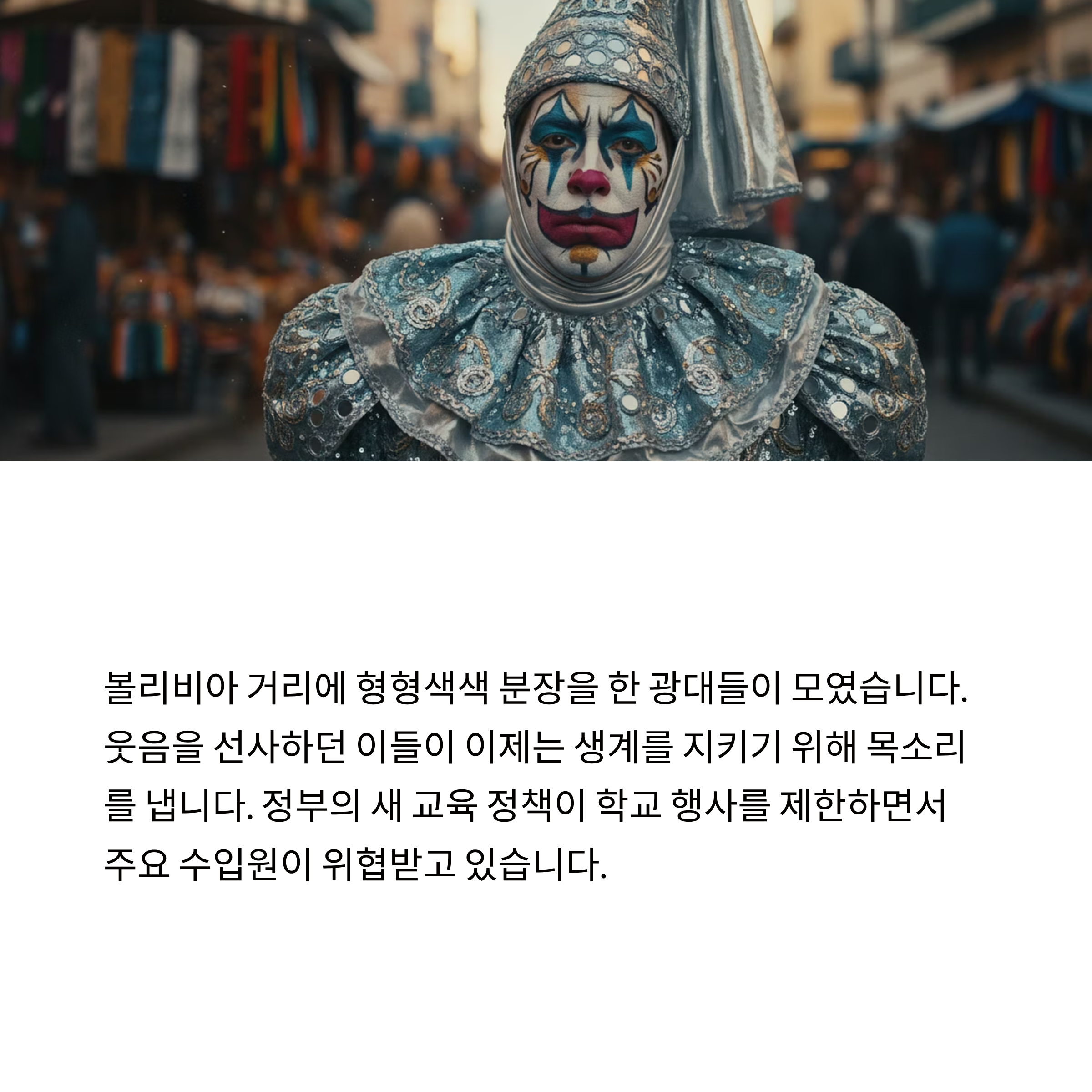 볼리비아의 거리에는 형형색색의 분장을 한 광대들이 모였습니다. 웃음을 선사하던 이들이 이제는 생계를 지키기 위해 목소리를 내고 있습니다. 정부의 새로운 교육 정책이 학교 행사를 제한하면서 이들의 주요 수입원이 위협받고 있기 때문입니다. 경제적 어려움이 심화되는 가운데, 이번 시위는 단순한 직업적 문제를 넘어 사회 전반의 현실을 반영하고 있습니다.