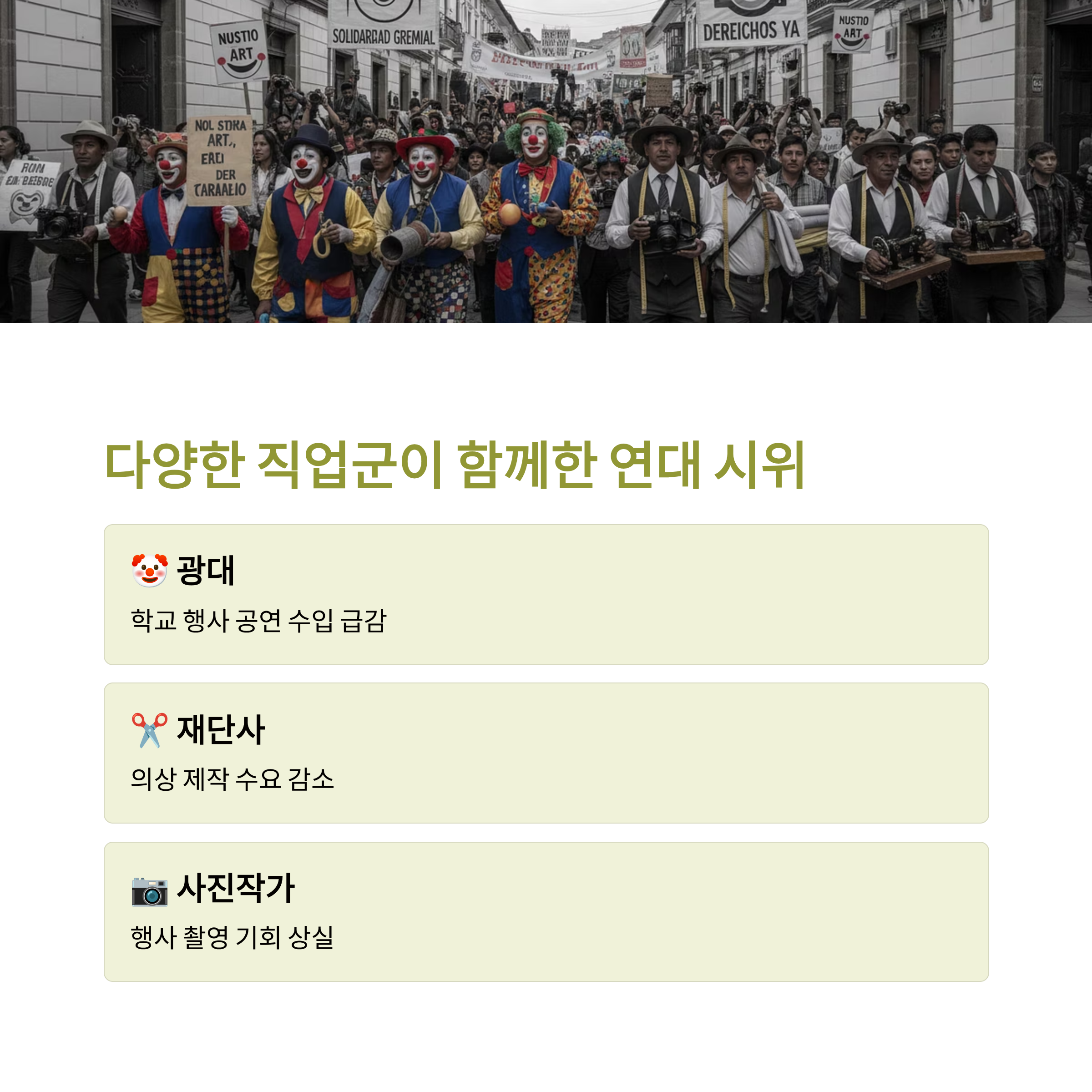 이번 시위에는 광대뿐 아니라 재단사와 사진작가들도 참여했습니다. 이들은 학교 행사 의존도가 높은 직종으로, 정책 변화가 직접적인 경제적 타격을 준다고 호소하며 연대의 목소리를 높였습니다.