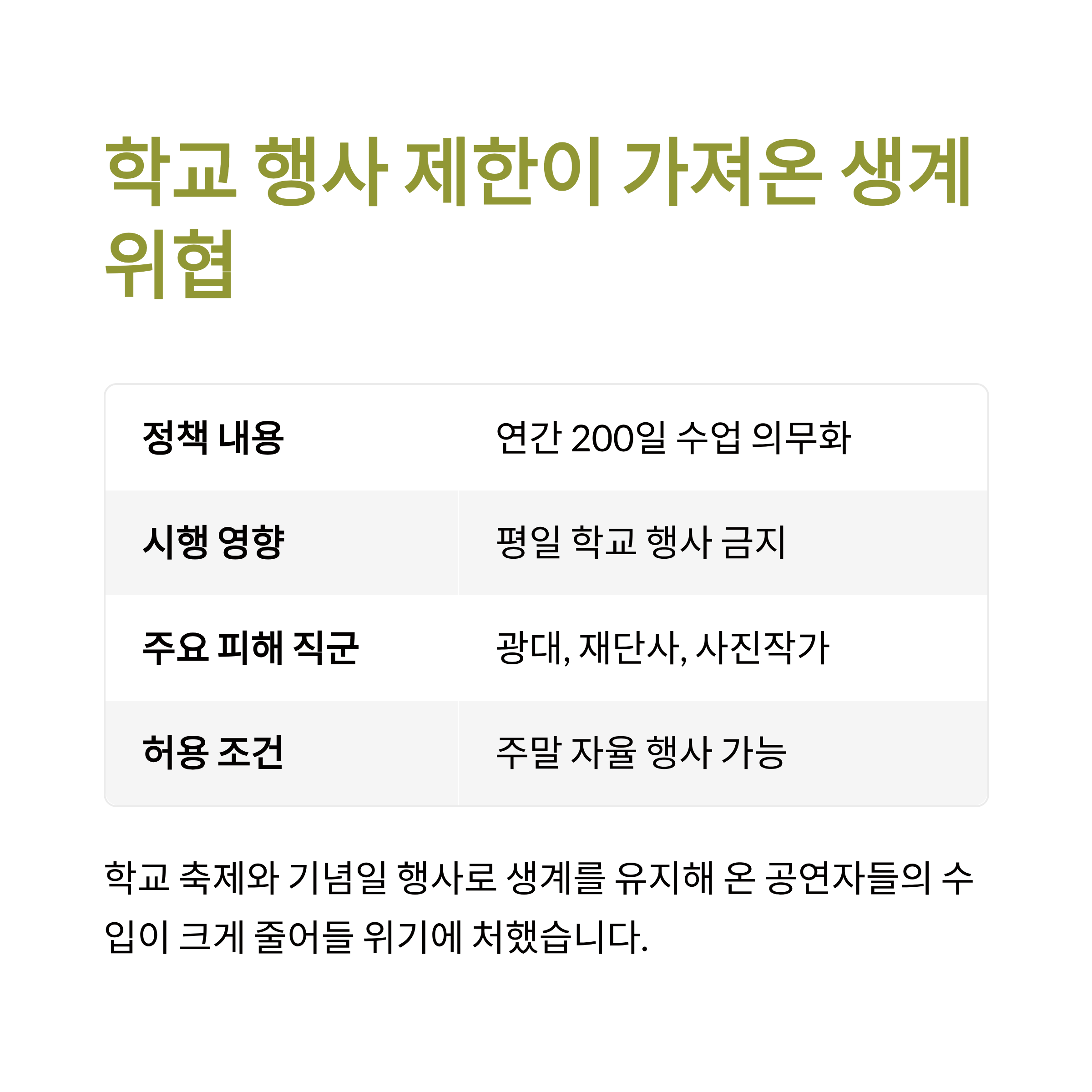 새로운 교육령은 연간 200일의 수업을 의무화하면서 평일 학교 행사를 금지하는 내용을 담고 있습니다. 이로 인해 학교 축제와 기념일 행사에 참여해 생계를 유지해 온 공연자들의 수입이 크게 줄어들 위기에 처했습니다.