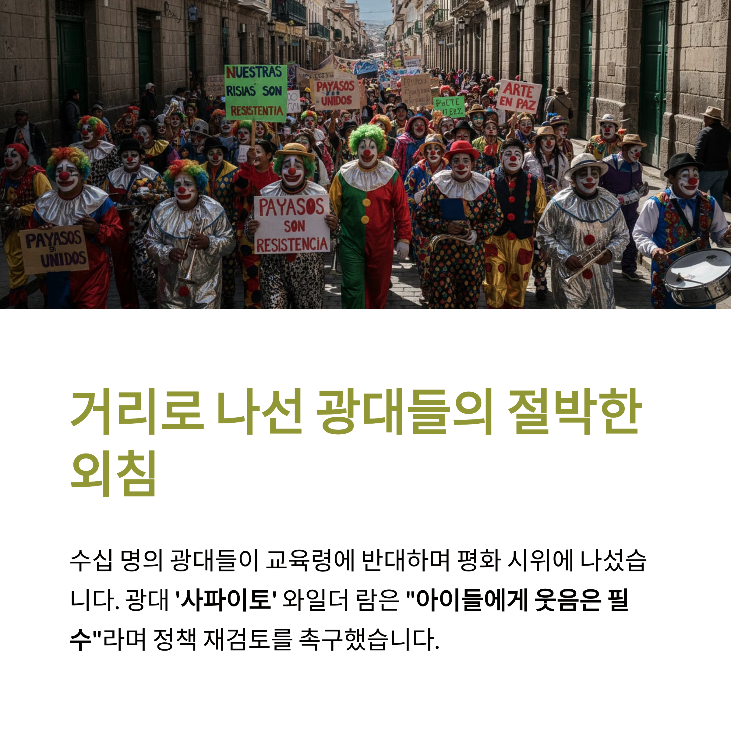볼리비아의 수십 명의 광대들은 정부의 교육령에 반대하며 거리 행진에 나섰습니다. 이들은 아이들에게 웃음을 선사하는 직업을 지키기 위해 평화로운 시위를 진행하며 대중의 관심을 끌었습니다. 특히 광대 ‘사파이토’로 알려진 와일더 람은 아이들에게 웃음은 필수적인 요소라고 강조하며 정책 재검토를 촉구했습니다.