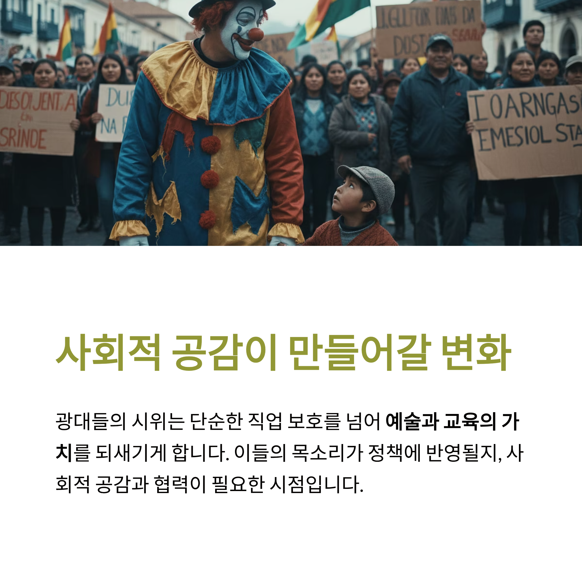 광대들의 시위는 단순한 직업 보호를 넘어 예술과 교육의 가치를 되새기게 합니다. 이들의 목소리가 정책에 반영될지 주목되며, 사회적 공감과 협력이 필요한 시점입니다.