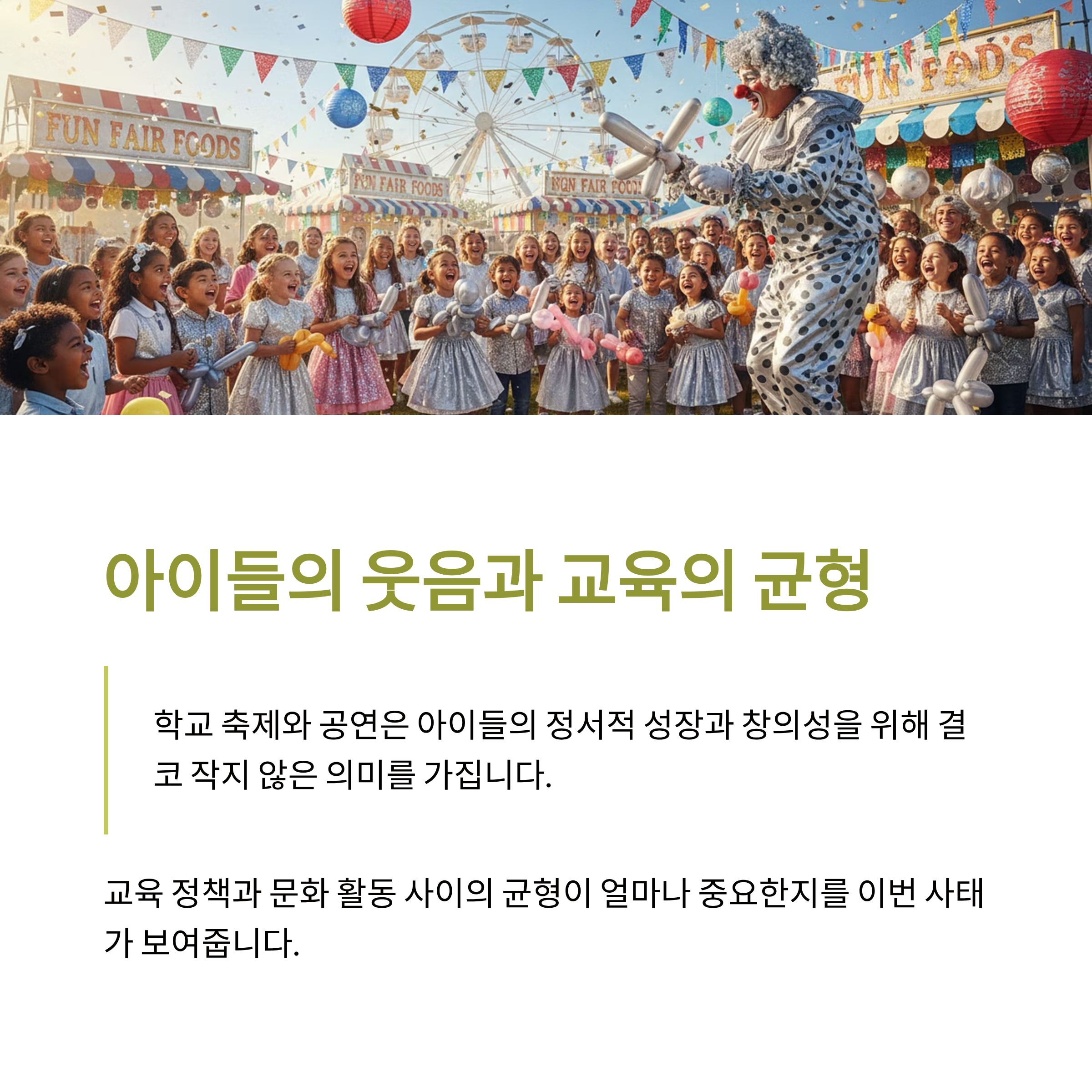 이번 사태는 교육 정책과 문화 활동 사이의 균형이 얼마나 중요한지를 보여줍니다. 아이들의 정서적 성장과 창의성을 위해 학교 축제와 공연이 가지는 의미는 결코 작지 않습니다.