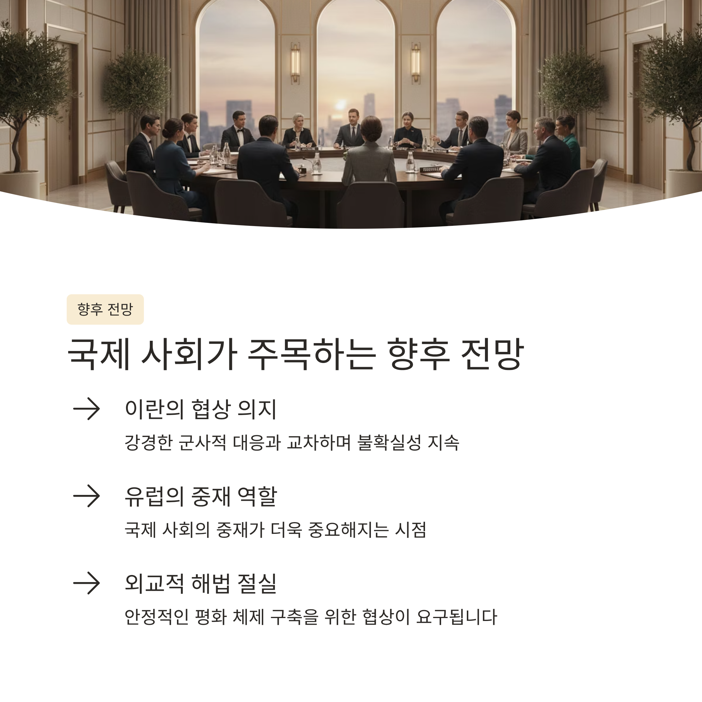 이란의 협상 의지와 강경한 군사적 대응이 교차하는 가운데, 유럽과 국제 사회의 중재 역할이 더욱 중요해지고 있습니다. 안정적인 평화 체제를 구축하기 위한 외교적 해법이 절실히 요구되는 시점입니다.