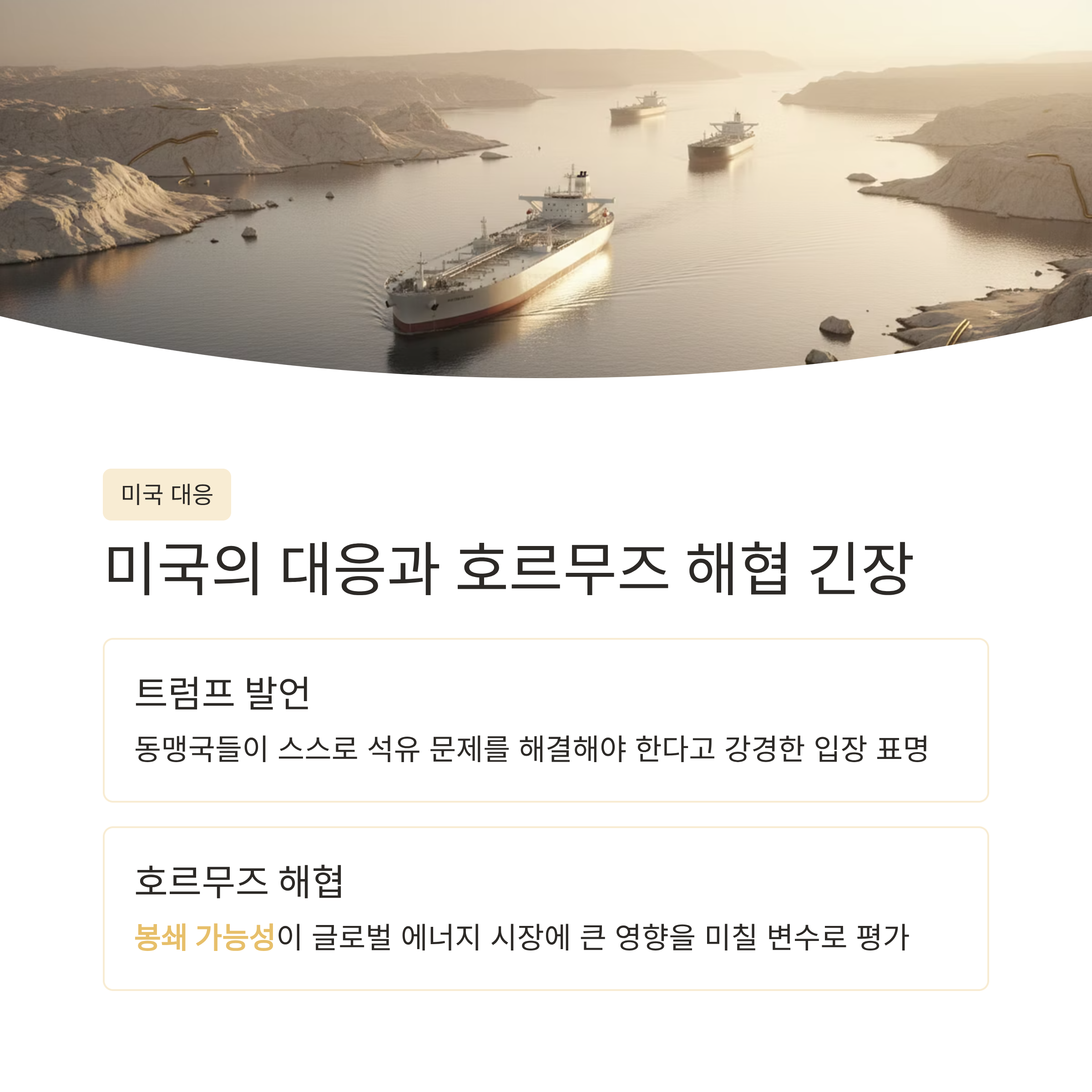미국 대통령 도널드 트럼프은 동맹국들이 스스로 석유 문제를 해결해야 한다고 발언하며 강경한 입장을 보였습니다. 특히 호르무즈 해협의 봉쇄 가능성은 글로벌 에너지 시장에 큰 영향을 미칠 수 있는 변수로 평가됩니다.