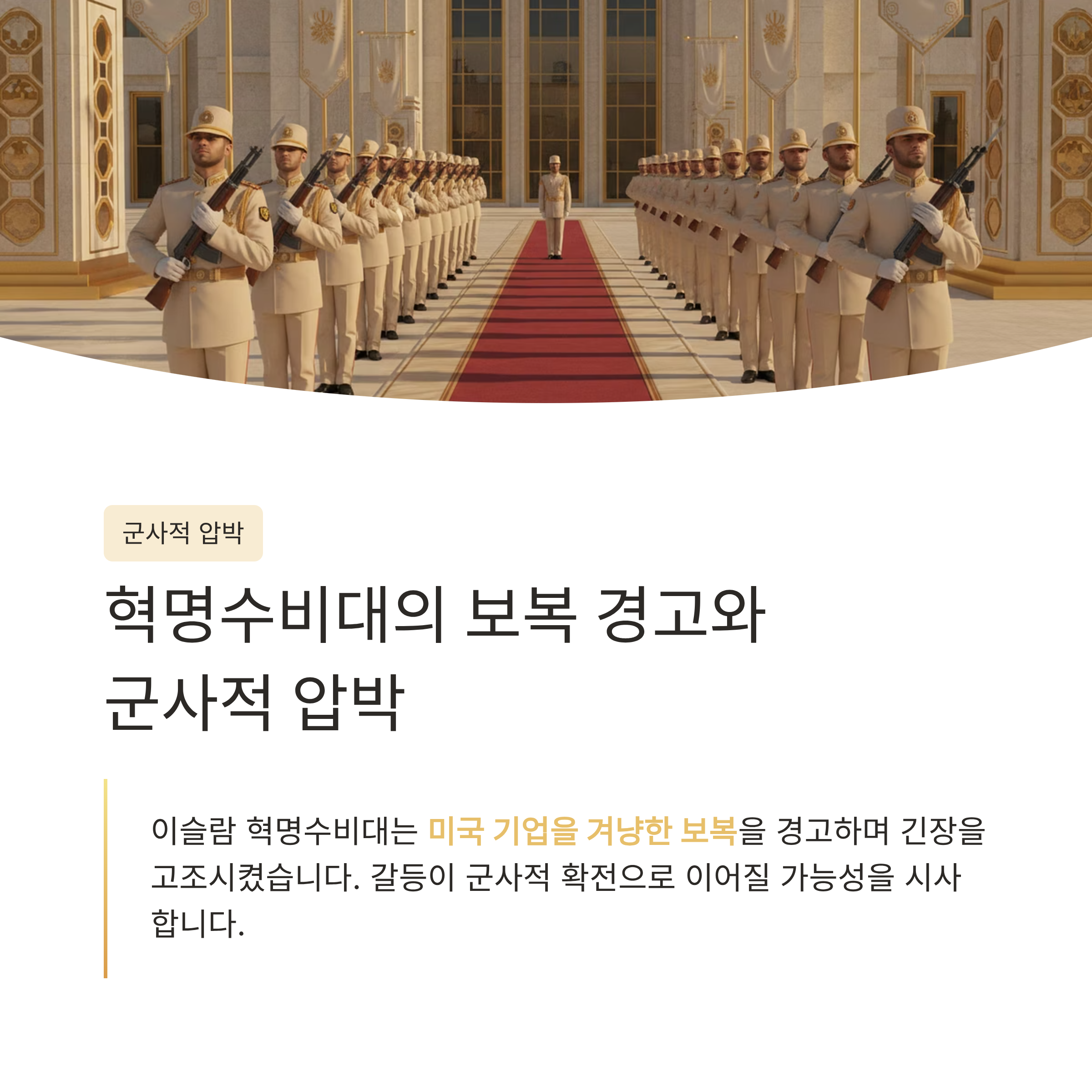 이슬람 혁명수비대는 미국 기업을 겨냥한 보복을 경고하며 긴장을 더욱 고조시켰습니다. 이는 갈등이 군사적 확전으로 이어질 가능성을 시사합니다.