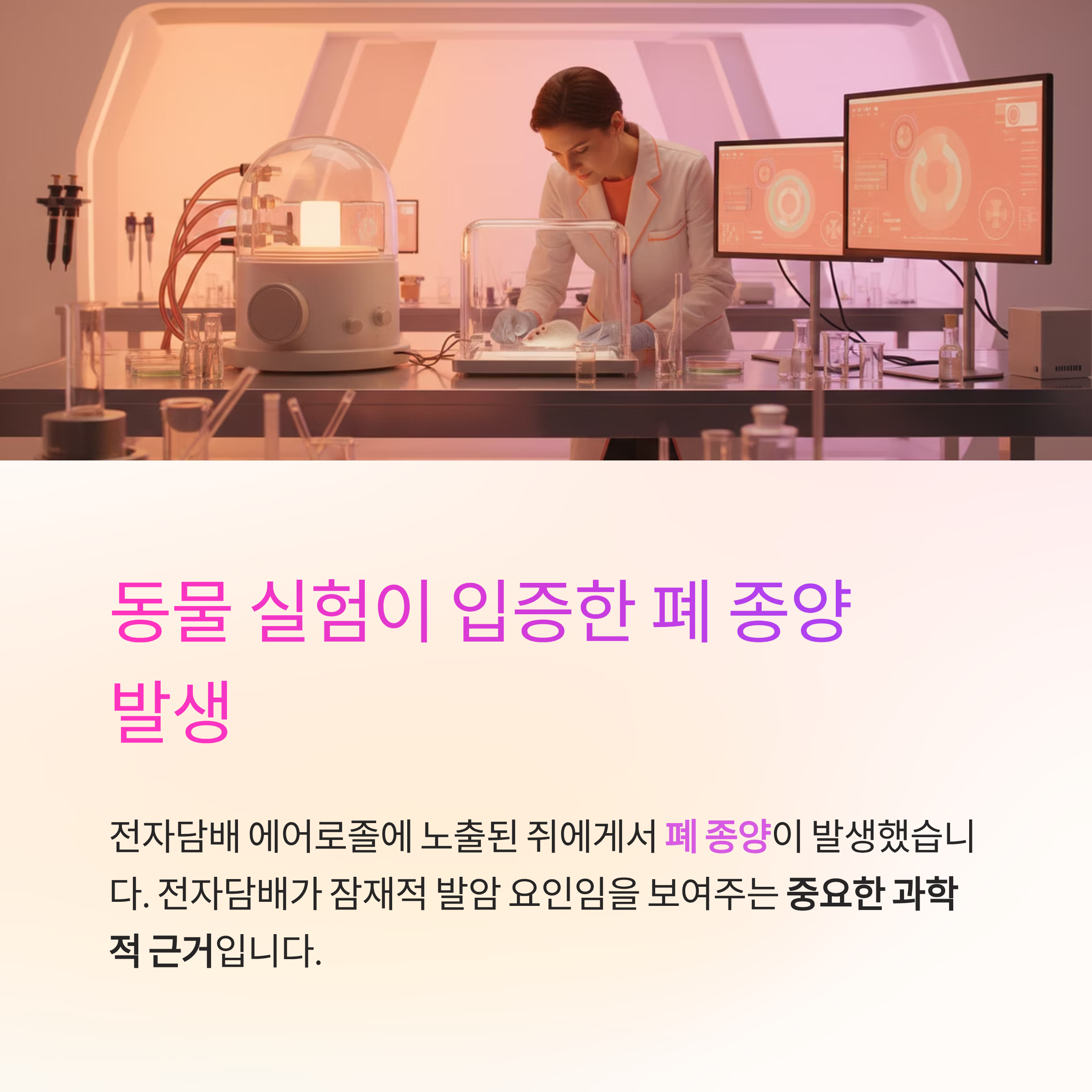 실험실 연구에서는 전자담배 에어로졸에 노출된 쥐에게서 폐 종양이 발생한 것으로 확인되었습니다. 이는 전자담배가 잠재적인 발암 요인이 될 수 있음을 보여주는 중요한 과학적 근거로 평가됩니다.