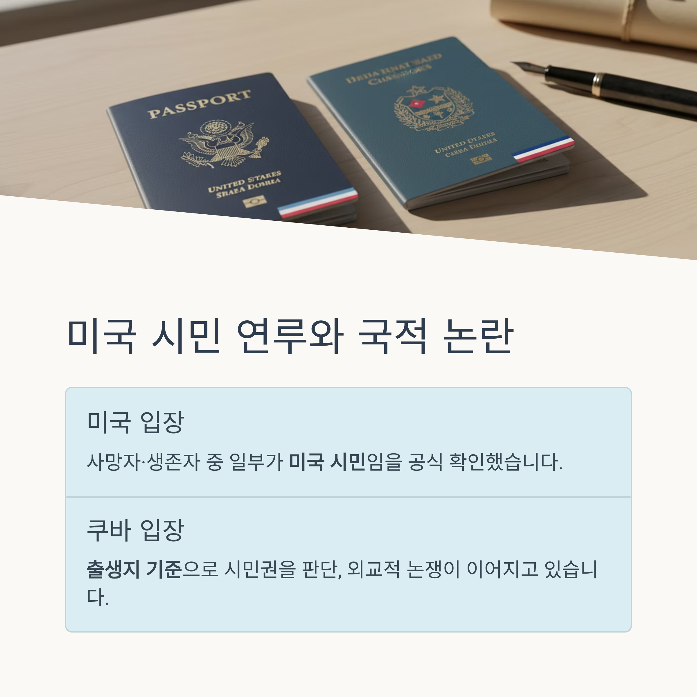 United States 당국은 사망자와 생존자 중 일부가 미국 시민이라고 확인했습니다. 반면 쿠바는 출생지를 기준으로 시민권을 판단하고 있어 국적 문제를 둘러싼 외교적 논쟁이 이어지고 있습니다.