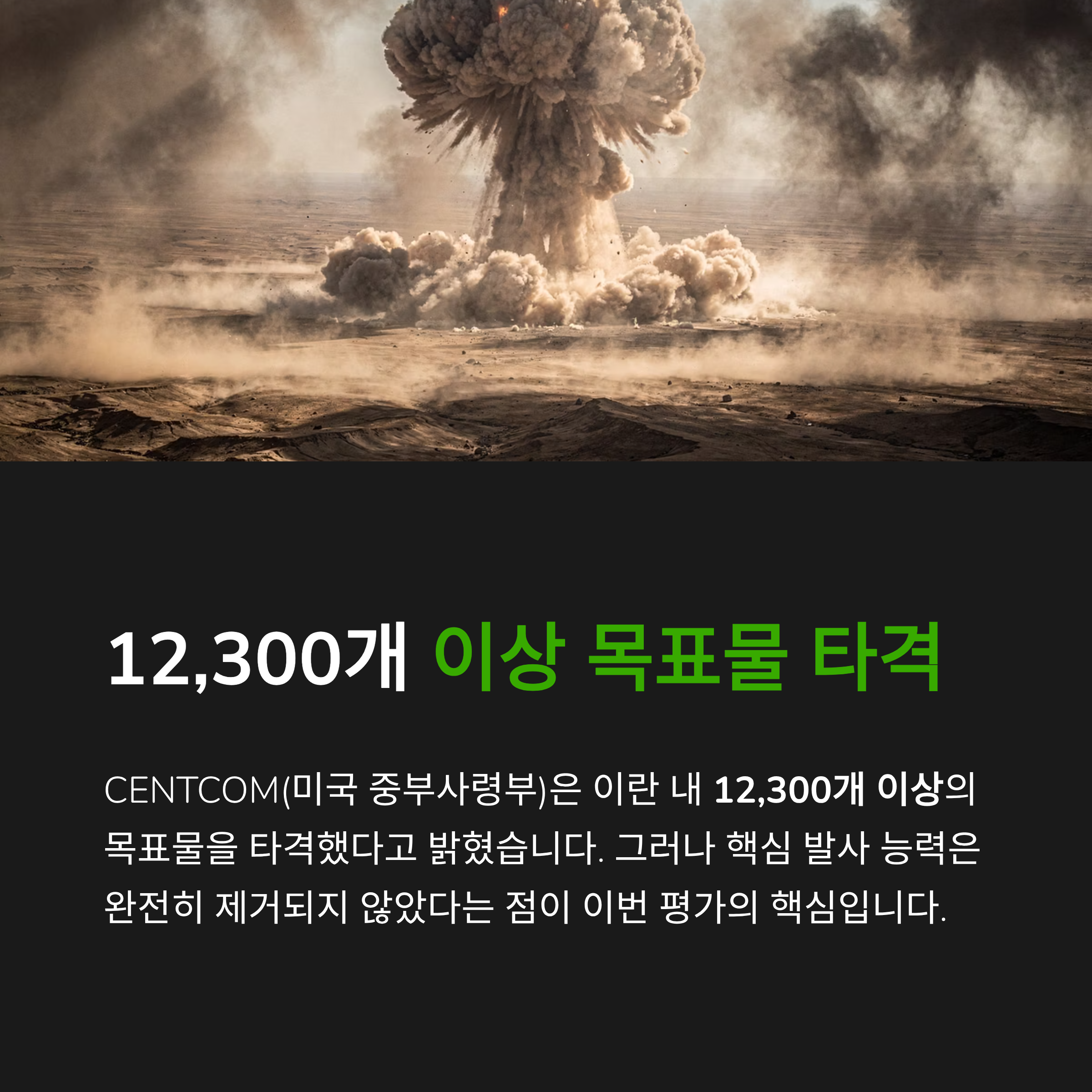 United States Central Command은 이란 내 12,300개 이상의 목표물을 타격했다고 밝혔습니다. 수치상으로는 대규모 작전이 진행된 것으로 보이지만, 핵심 발사 능력은 완전히 제거되지 않았다는 점이 이번 평가의 핵심입니다.