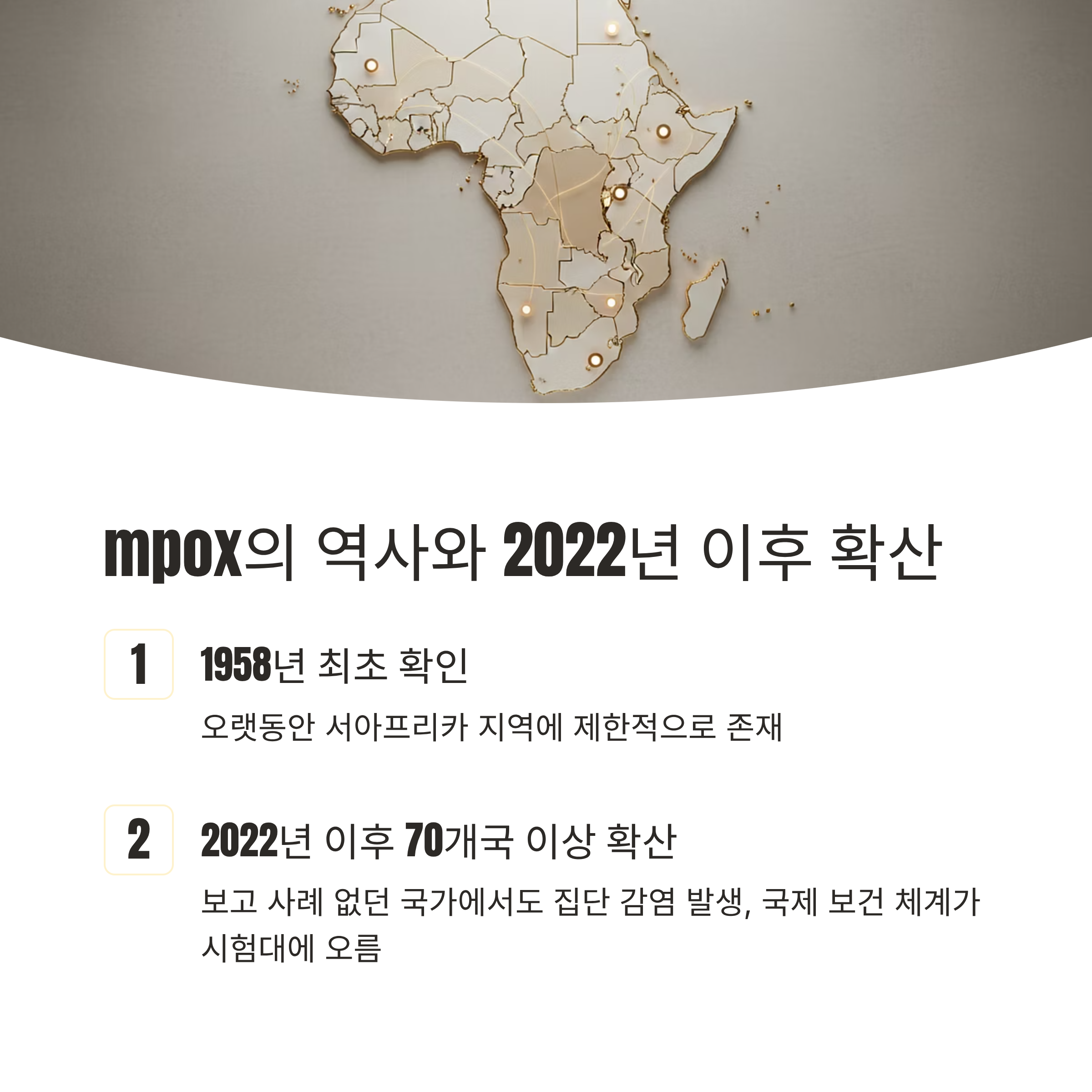 mpox는 1958년에 처음 확인된 이후 오랫동안 서아프리카 지역에 제한적으로 존재했습니다. 하지만 2022년 이후 70개국 이상으로 확산되며 전 세계적인 관심을 받았습니다. 이전에는 보고 사례가 없던 국가들에서도 집단 감염이 발생하면서 국제 보건 체계가 시험대에 올랐습니다.