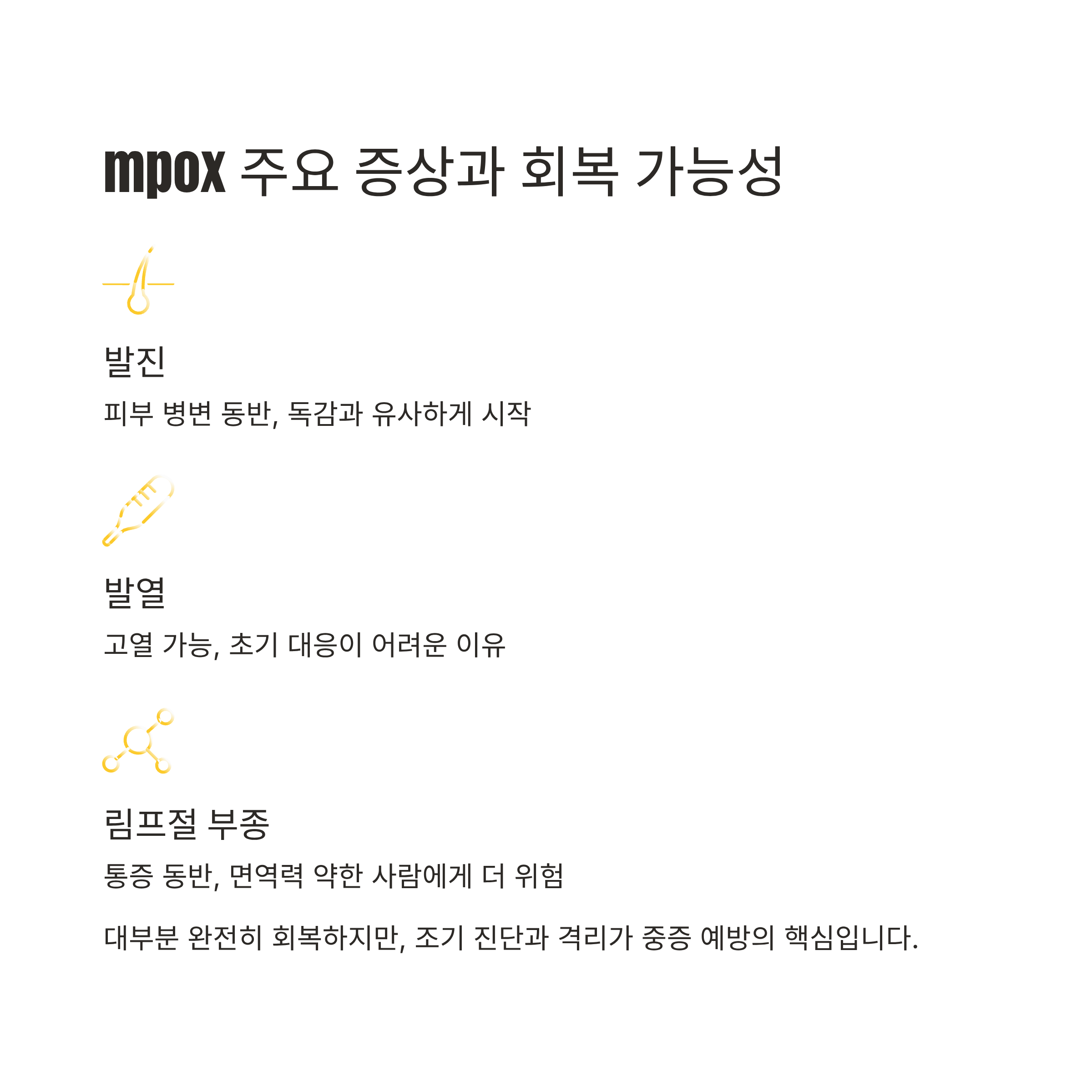 mpox는 발진과 발열이 대표적인 증상입니다. 대부분의 감염자는 완전히 회복하지만, 일부는 중증으로 진행될 수 있습니다. 특히 면역력이 약한 사람에게는 더 큰 위험이 될 수 있어 조기 진단과 격리가 중요합니다.