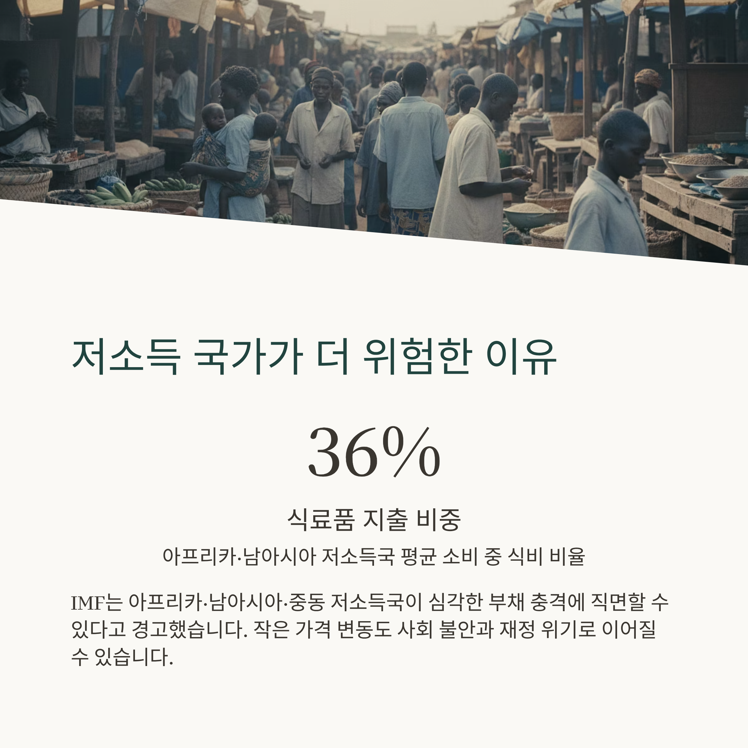 IMF는 특히 아프리카, 남아시아, 중동 지역 저소득 국가들이 ‘위험한’ 부채 충격에 직면할 수 있다고 경고했습니다. 이들 국가에서는 식료품 지출이 평균 소비의 약 36%를 차지하고 있어, 식량 가격 상승이 곧 생존 문제로 직결됩니다. 작은 가격 변동도 사회적 불안과 재정 위기로 이어질 수 있는 구조입니다.