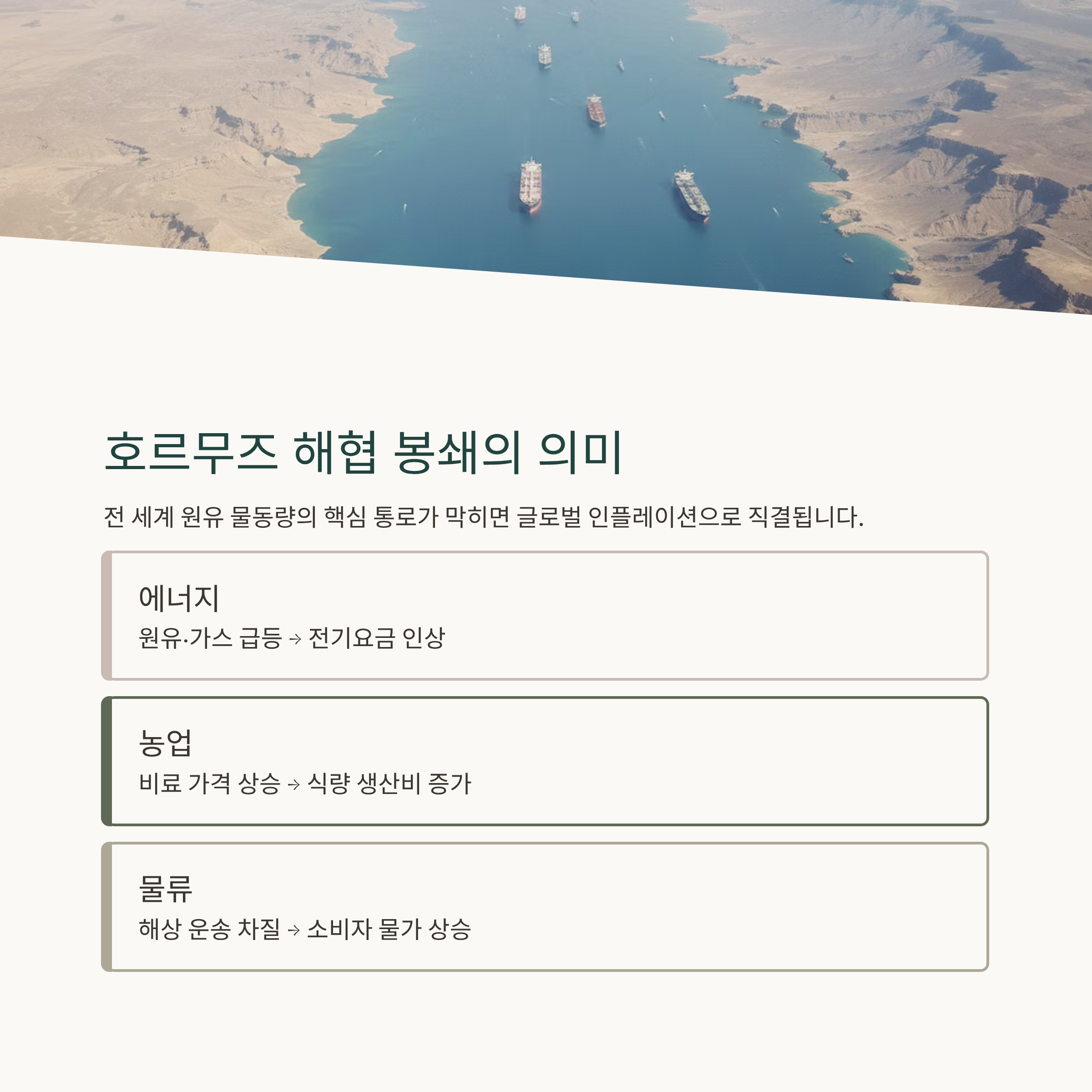 호르무즈 해협은 전 세계 원유 물동량의 상당 부분이 통과하는 전략적 요충지입니다. 이곳이 막히면 단순한 지역 분쟁을 넘어 글로벌 인플레이션 압력으로 이어집니다. 특히 에너지 가격 상승은 운송비와 생산비 전반에 영향을 미치며, 식료품 가격까지 끌어올리는 연쇄 효과를 만들어냅니다.