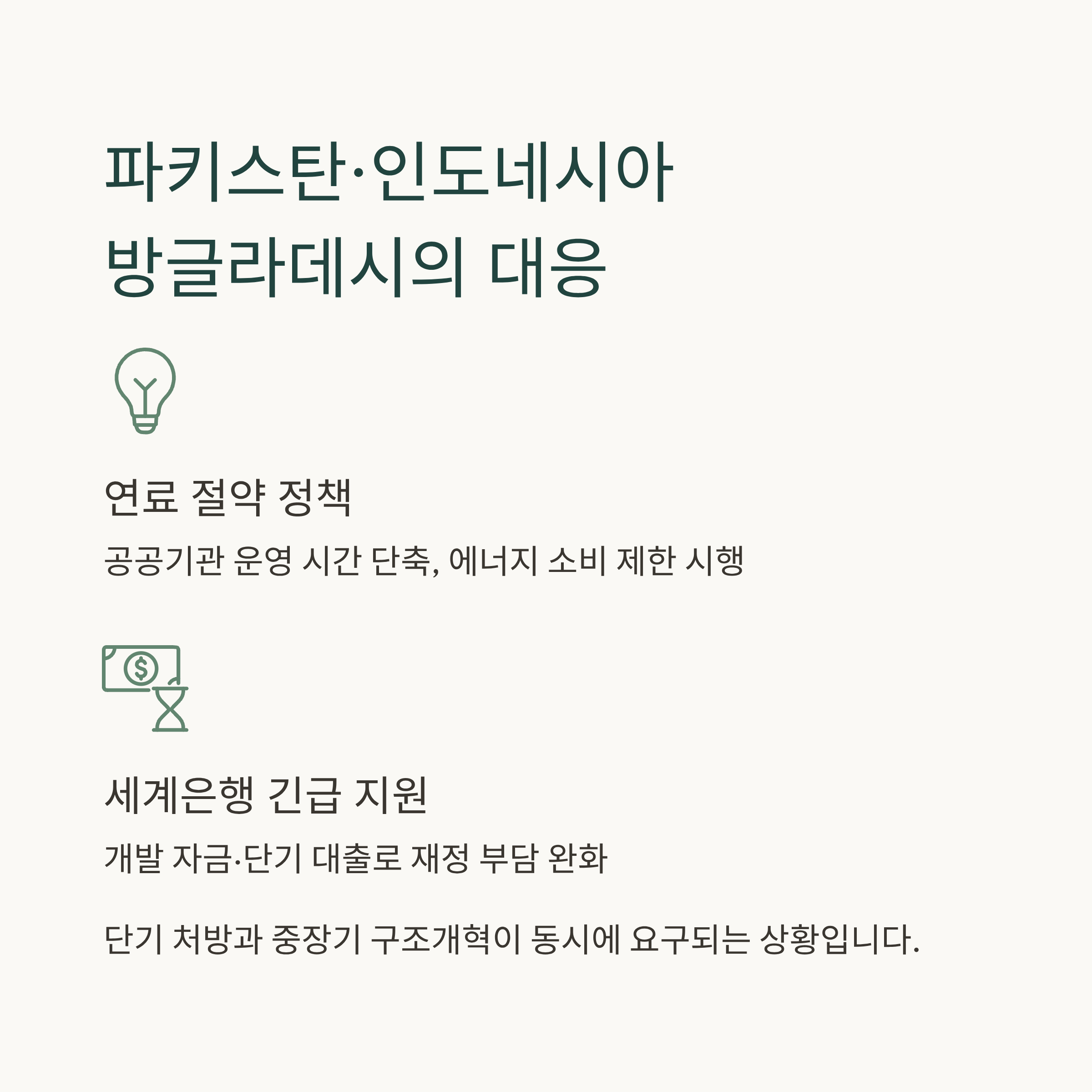 이미 일부 국가는 연료 절약 정책을 도입했습니다. 공공기관 운영 시간 단축, 에너지 소비 제한 조치 등이 시행되고 있습니다. 동시에 세계은행은 긴급 예산 수요를 충당하기 위한 개발 자금과 단기 대출을 제공하며 회원국들의 재정 부담을 덜어주고 있습니다. 단기 처방과 중장기 구조개혁이 동시에 요구되는 상황입니다.