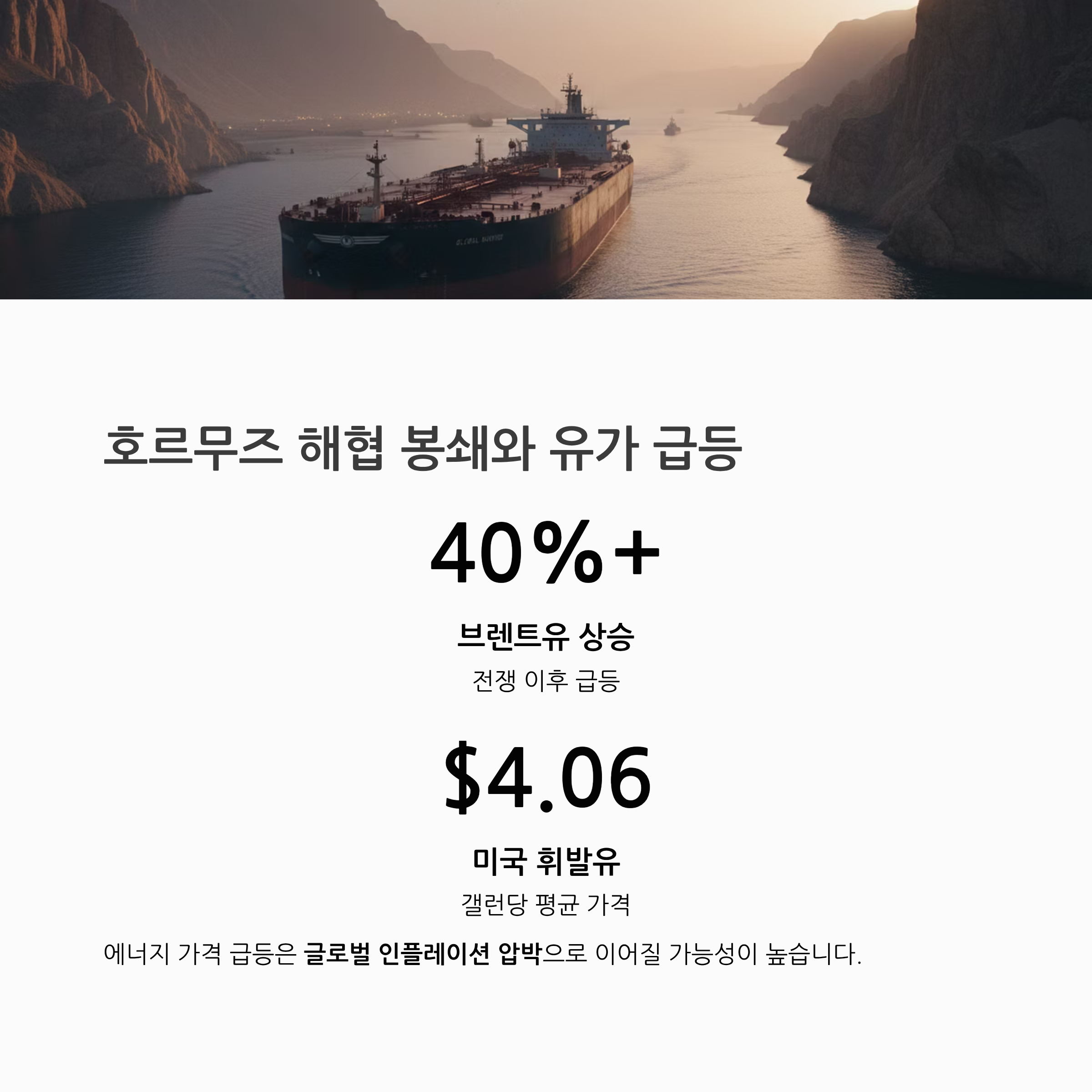 브렌트유 가격은 전쟁 이후 40% 이상 급등했고, 미국 평균 휘발유 가격은 갤런당 4.064달러까지 상승했습니다. 이는 글로벌 인플레이션 압박으로 이어질 가능성이 높습니다.