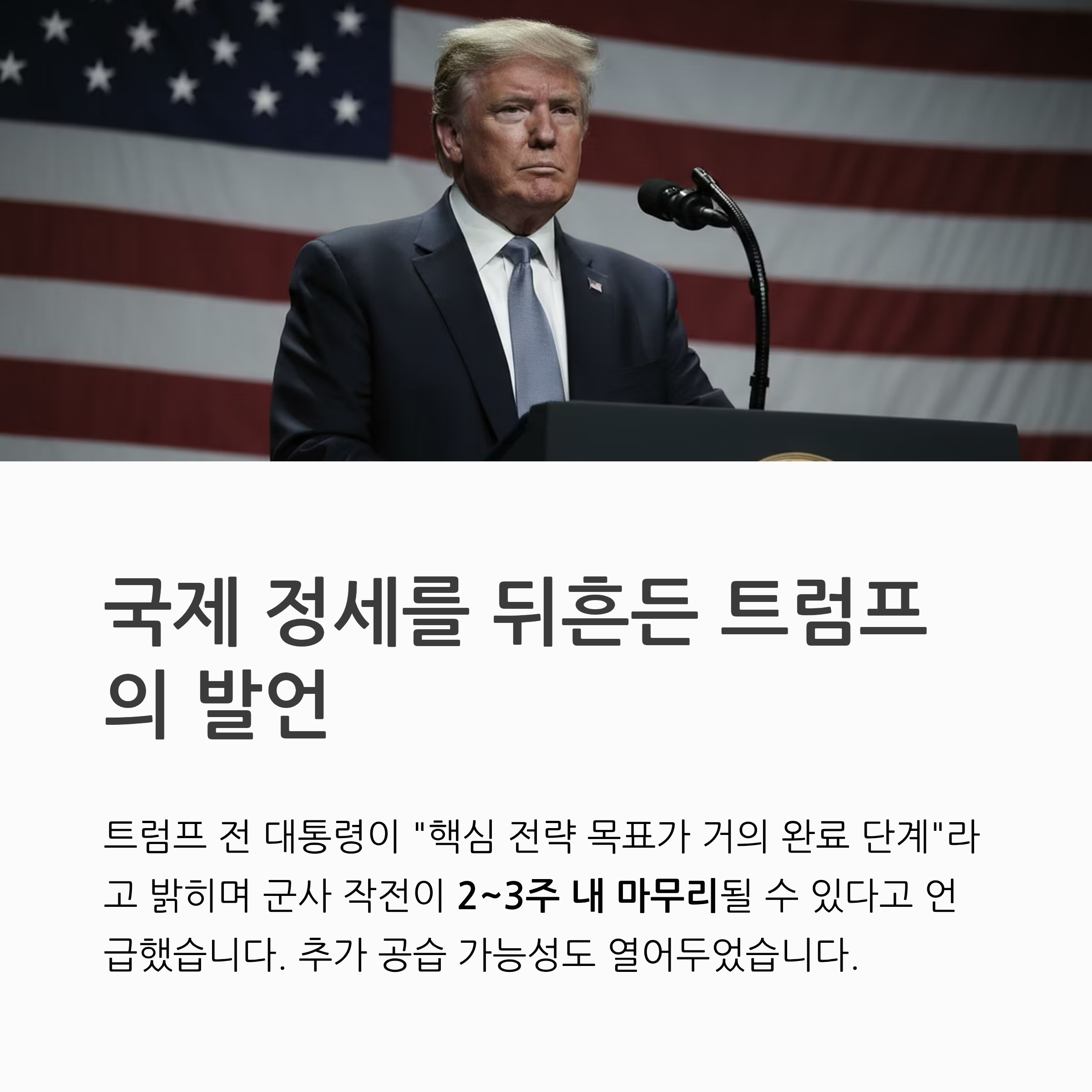최근 Donald Trump 전 대통령이 이란 전쟁과 관련해 “핵심 전략 목표가 거의 완료 단계에 있다”고 밝히면서 국제 정세가 다시 크게 흔들리고 있습니다. 정확한 종료 시점은 제시하지 않았지만, 군사 작전이 2~3주 내 마무리될 수 있다고 언급하며 추가 공습 가능성도 열어두었습니다.