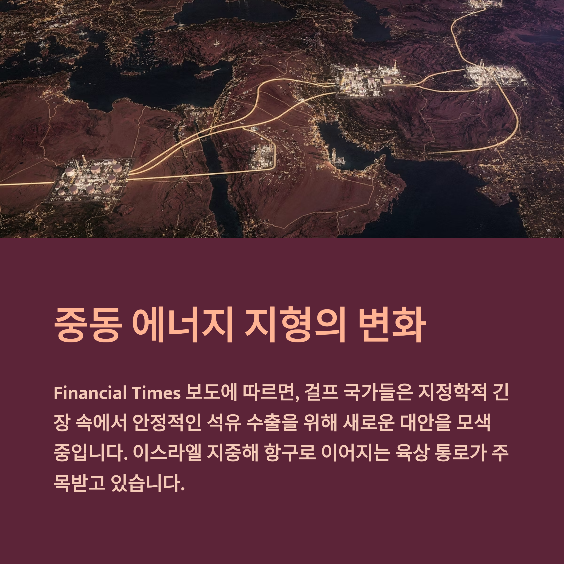 중동의 에너지 지형이 빠르게 변화하고 있습니다. 최근 Financial Times 보도에 따르면 걸프 국가들은 지정학적 긴장 속에서 안정적인 석유 수출을 위해 새로운 대안을 모색하고 있습니다. 특히 이스라엘의 지중해 항구로 이어지는 육상 통로가 주목받으며, 세계 에너지 시장의 판도에 새로운 흐름이 형성되고 있습니다.