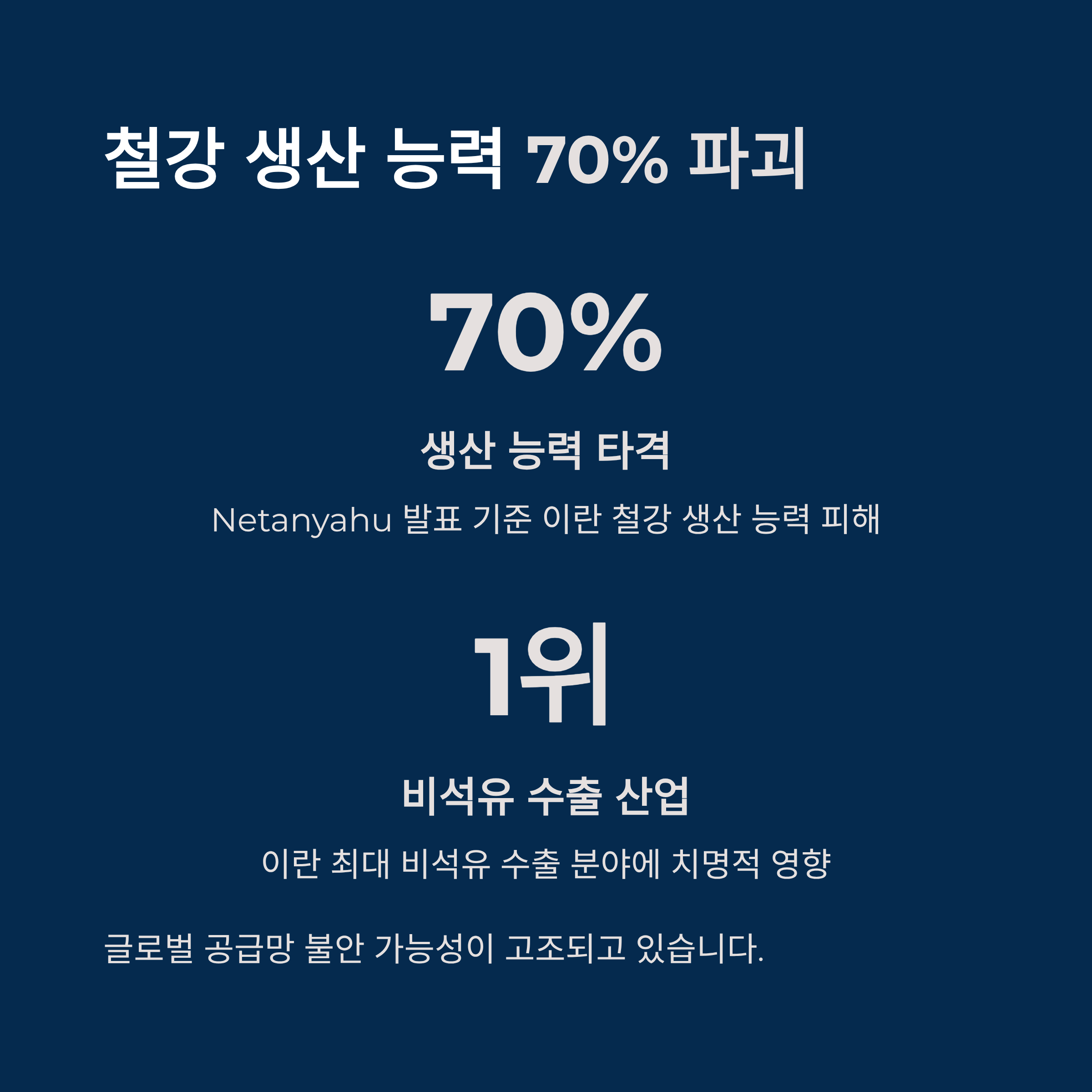 이스라엘 총리의 발표에 따르면 이란 철강 생산 능력의 약 70%가 파괴된 것으로 전해졌습니다. 이는 비석유 분야 최대 수출 산업에 치명적인 영향을 미치며 글로벌 경제에도 파장을 예고하고 있습니다.