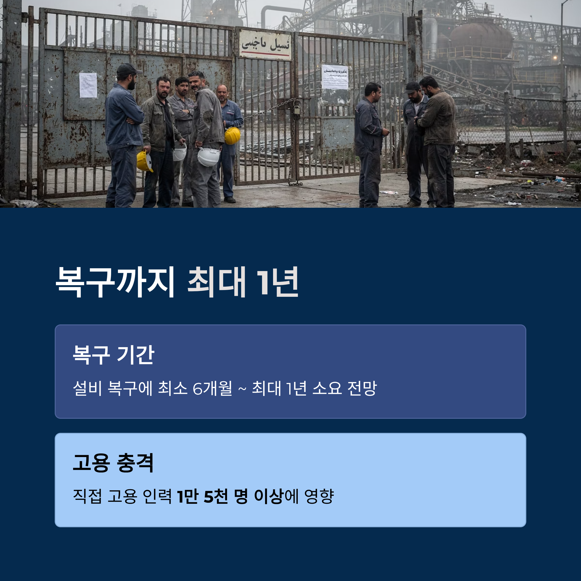 후제스탄 철강 관계자에 따르면 설비 복구에는 최소 6개월에서 최대 1년이 소요될 것으로 전망됩니다. 이는 1만 5천 명 이상의 직접 고용 인력에게 영향을 미치며 지역 경제에도 깊은 여운을 남기고 있습니다.
