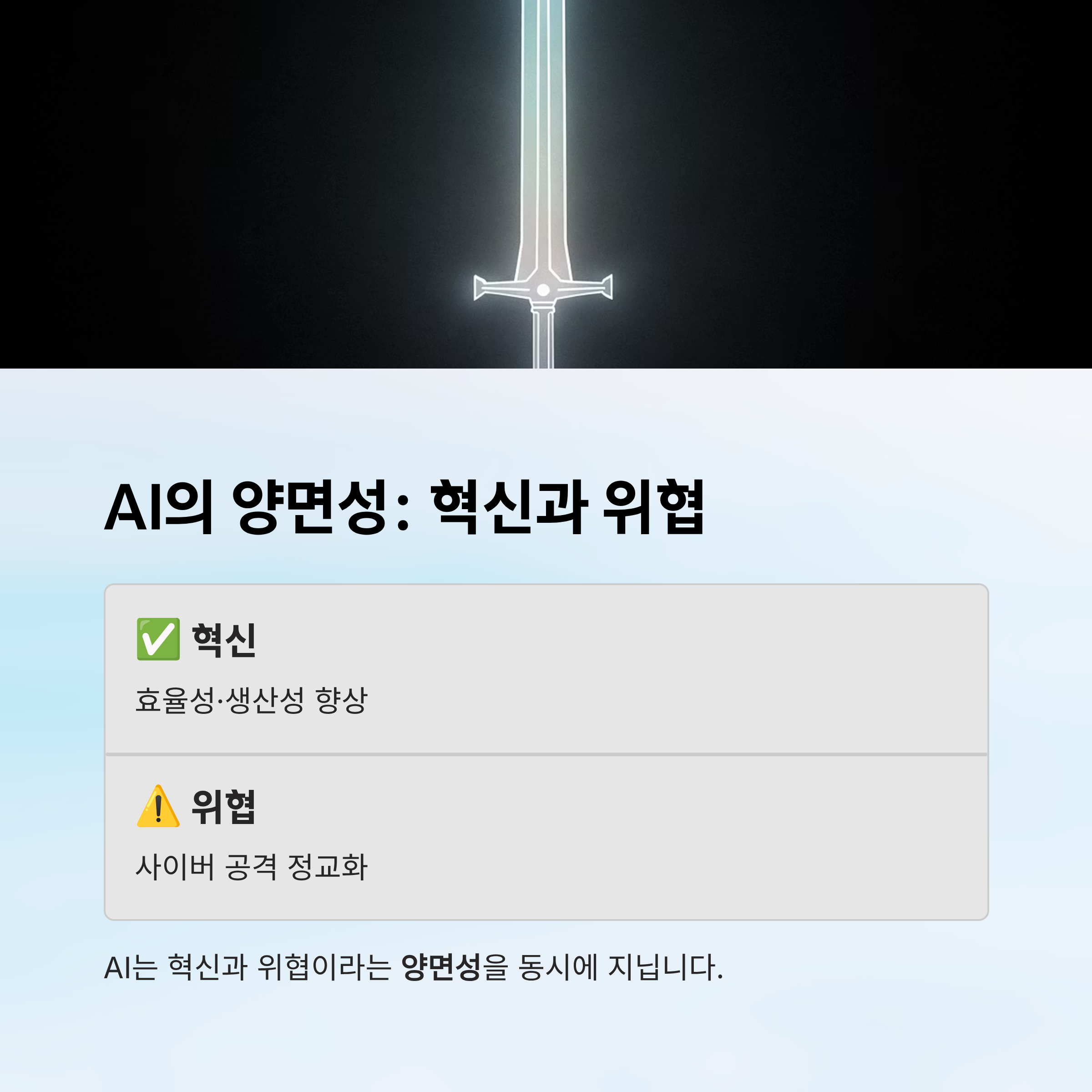 AI는 혁신과 위협이라는 양면성을 동시에 지니고 있습니다. 효율성과 생산성을 높이는 동시에 사이버 공격의 정교함을 강화할 가능성도 내포하고 있습니다.