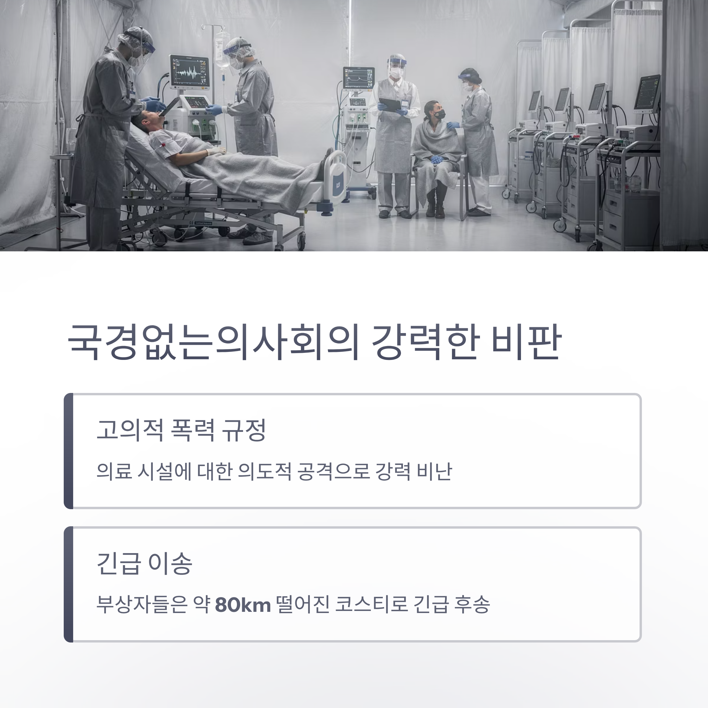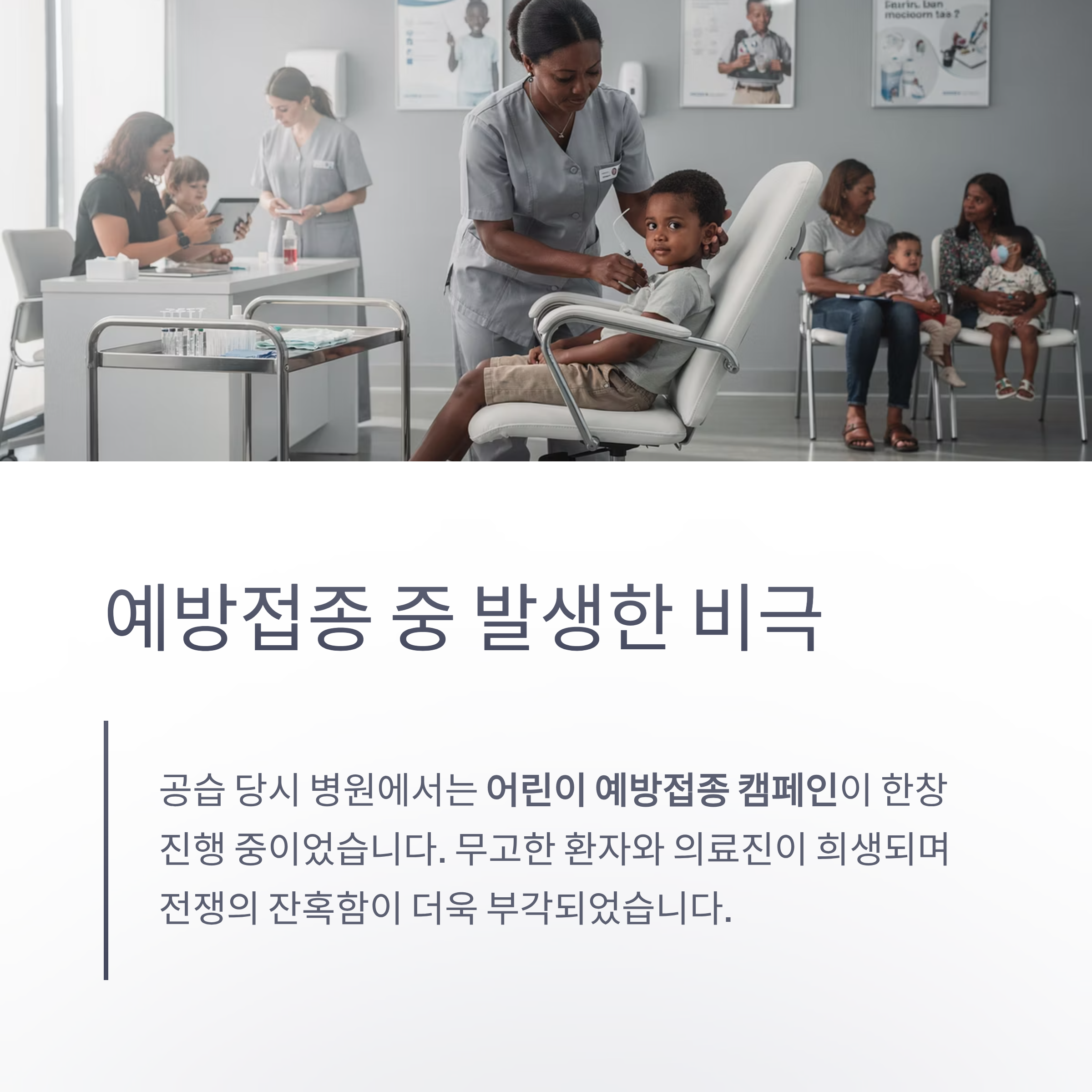 공습 당시 병원에서는 어린이 예방접종 캠페인이 진행 중이었습니다. 무고한 환자와 의료진이 희생되면서 전쟁의 잔혹함이 더욱 부각되었습니다.