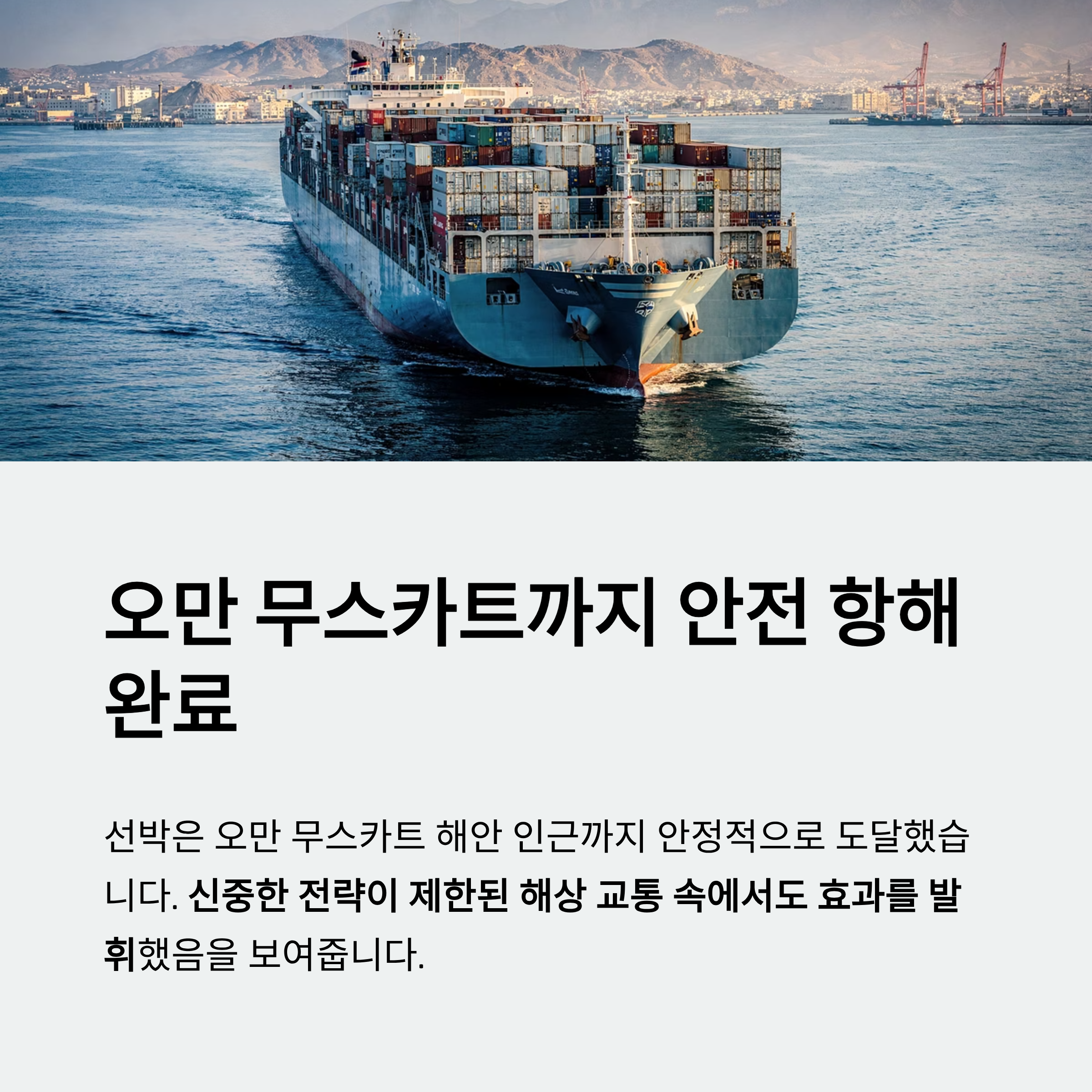 선박은 이후 오만 무스카트 해안 인근까지 도달하며 안정적인 항해를 이어갔습니다. 이는 제한된 해상 교통 속에서도 신중한 전략이 효과를 발휘했음을 보여줍니다.