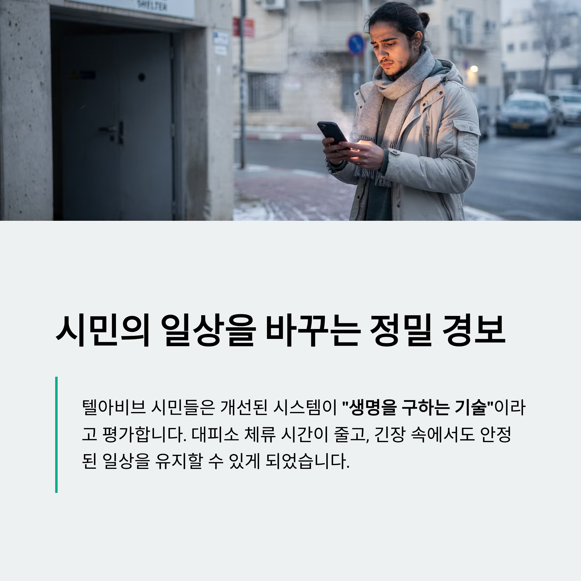 텔아비브에 거주하는 시민들은 개선된 시스템이 생명을 구하는 기술이라고 평가하고 있습니다. 이전보다 대피소에 머무는 시간이 줄어들었으며, 긴장 속에서도 보다 안정된 일상을 유지할 수 있게 되었습니다.