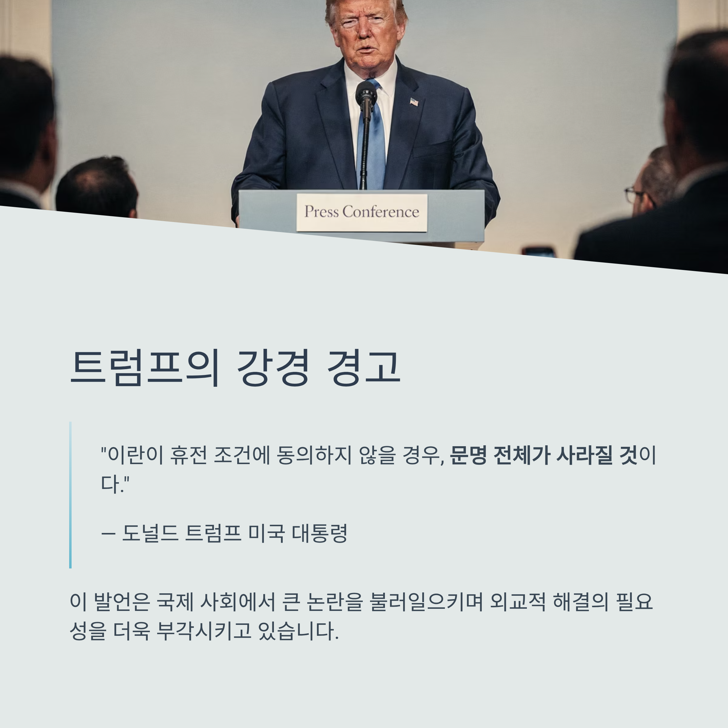 도널드 트럼프 미국 대통령은 이란이 휴전 조건에 동의하지 않을 경우 “문명 전체가 사라질 것”이라는 강경한 경고를 내놓으며 긴장을 더욱 고조시켰습니다. 이러한 발언은 국제 사회에서 논란을 불러일으키며 외교적 해결의 필요성을 더욱 부각시키고 있습니다.