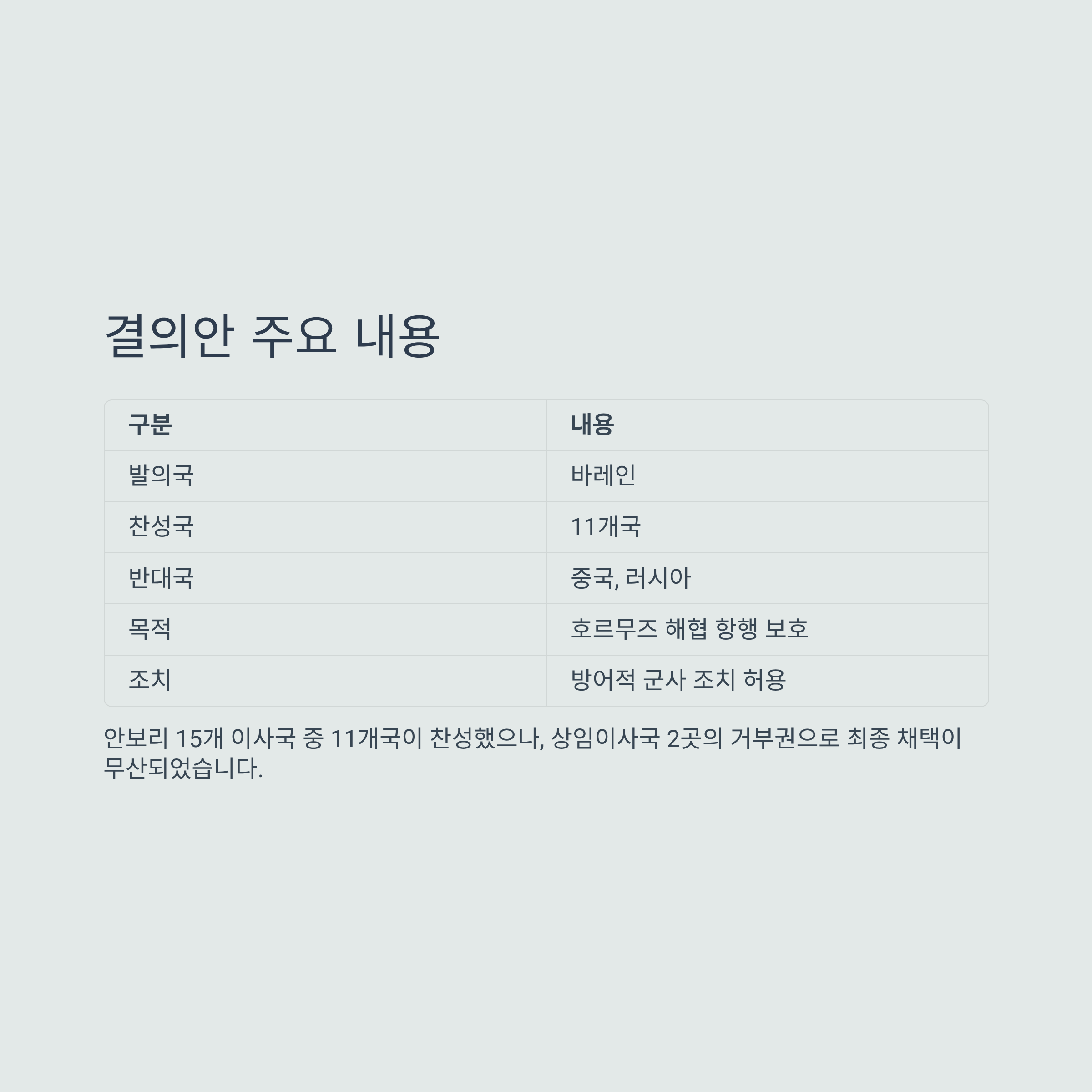 이번 결의안은 바레인이 주도하여 작성되었으며, 호르무즈 해협의 재개방과 해상 안전 보장을 목표로 했습니다. 유엔 안전보장이사회 15개 이사국 중 11개국이 찬성표를 던지며 국제적 지지를 받았지만, 상임이사국인 중국과 러시아의 거부권 행사로 최종 채택에는 이르지 못했습니다.
