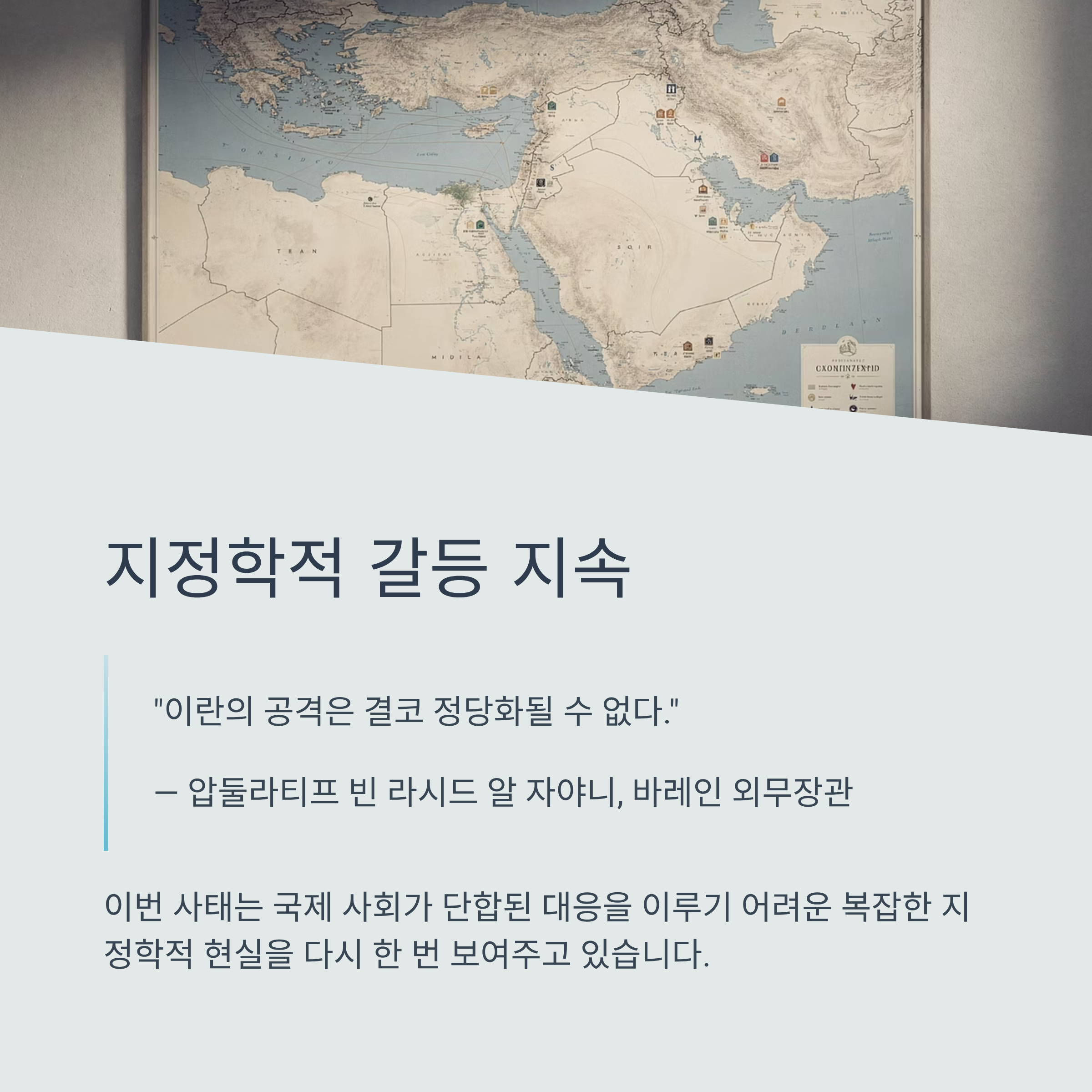바레인 외무장관 압둘라티프 빈 라시드 알 자야니는 이란의 공격이 정당화될 수 없다고 강조하며 지역 내 갈등이 여전히 해결되지 않았음을 시사했습니다. 이번 사태는 국제 사회가 단합된 대응을 이루기 어려운 복잡한 지정학적 현실을 다시 한 번 보여주고 있습니다.