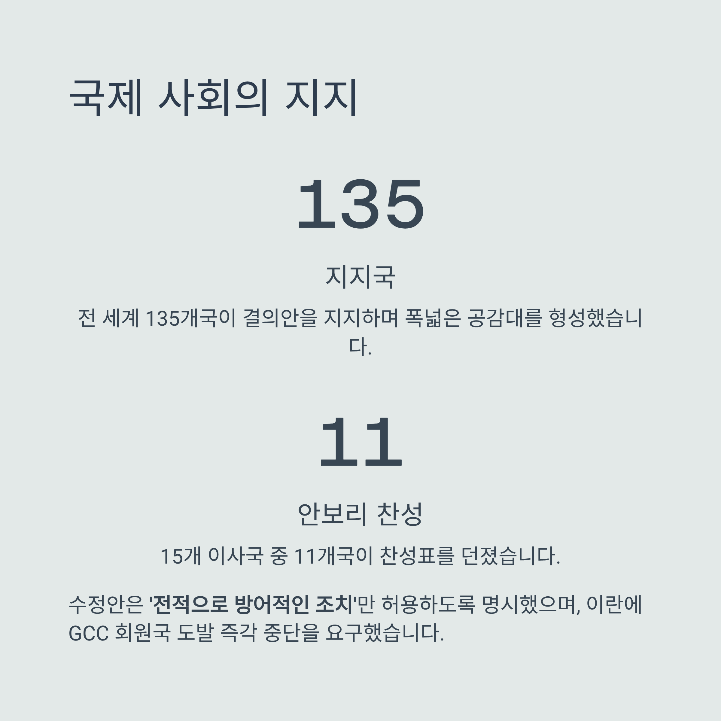 해당 결의안은 135개국의 지지를 받으며 국제 사회의 폭넓은 공감대를 형성했습니다. 수정된 내용에서는 ‘전적으로 방어적인 조치’만을 허용하도록 명시하며 긴장 완화를 목표로 했고, 이란에 대해 걸프협력회의(GCC) 회원국들에 대한 도발을 즉각 중단할 것을 요구했습니다.