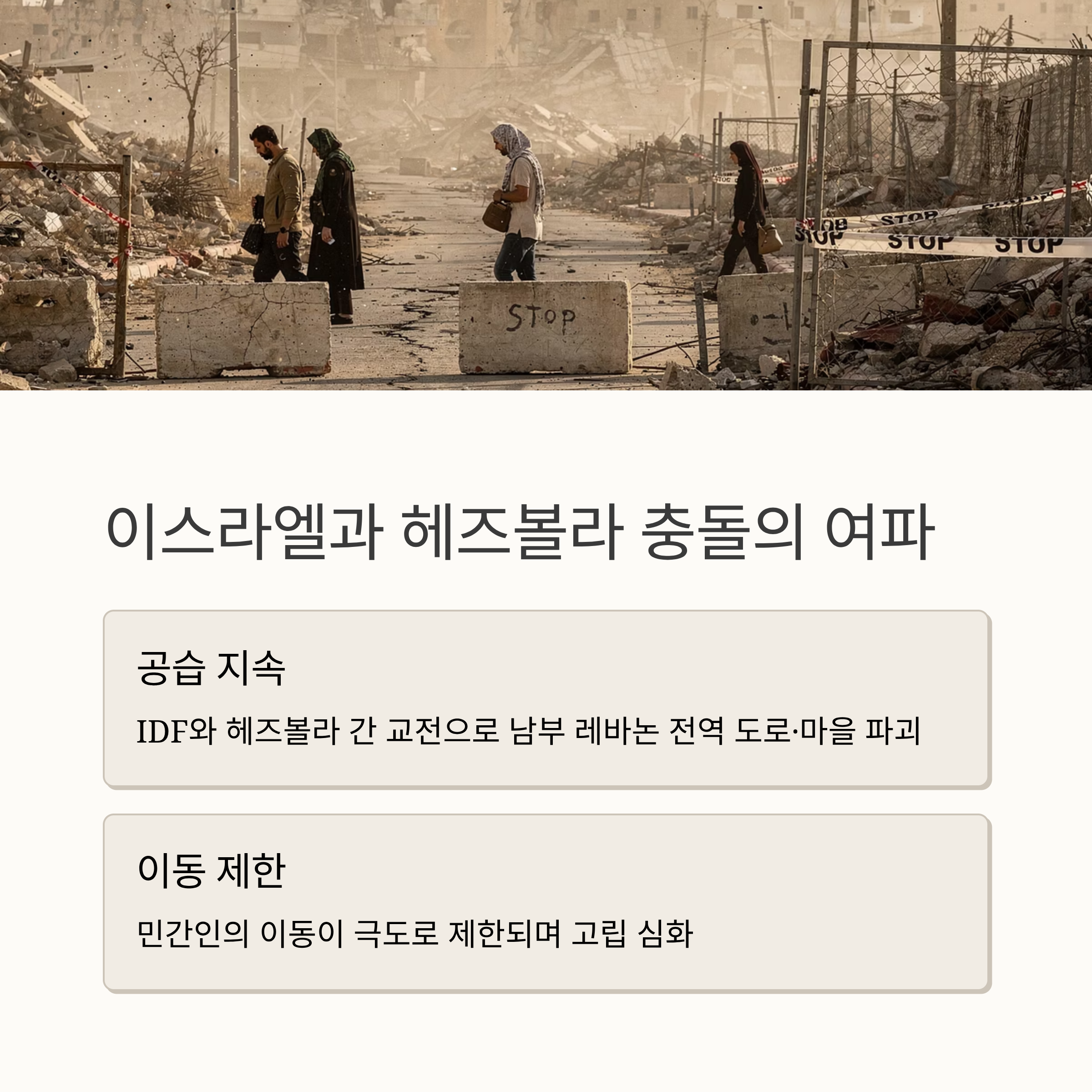 이번 사태는 Israel Defense Forces와 Hezbollah 간의 지속적인 충돌 속에서 발생했습니다. 남부 레바논 전역에서 공습과 교전이 이어지며 도로와 마을이 파괴되고, 민간인의 이동이 극도로 제한되고 있습니다.