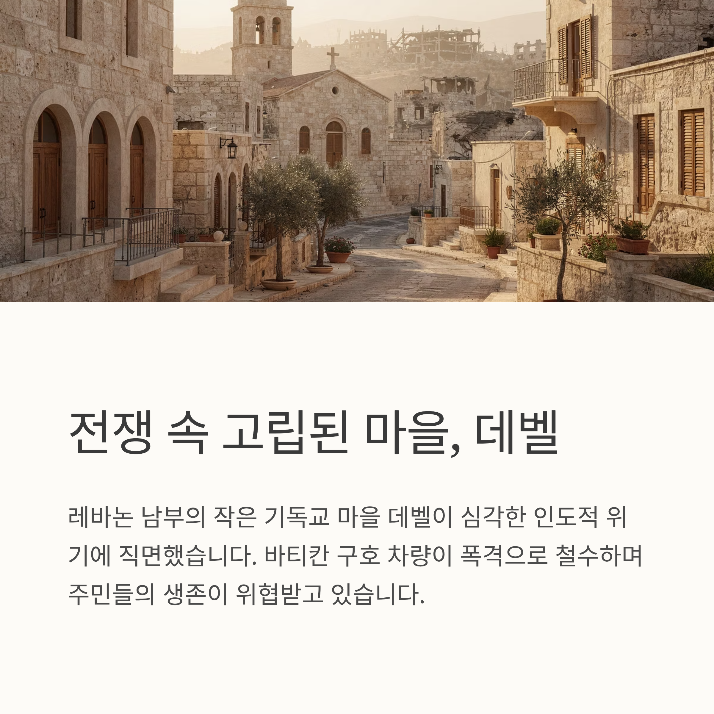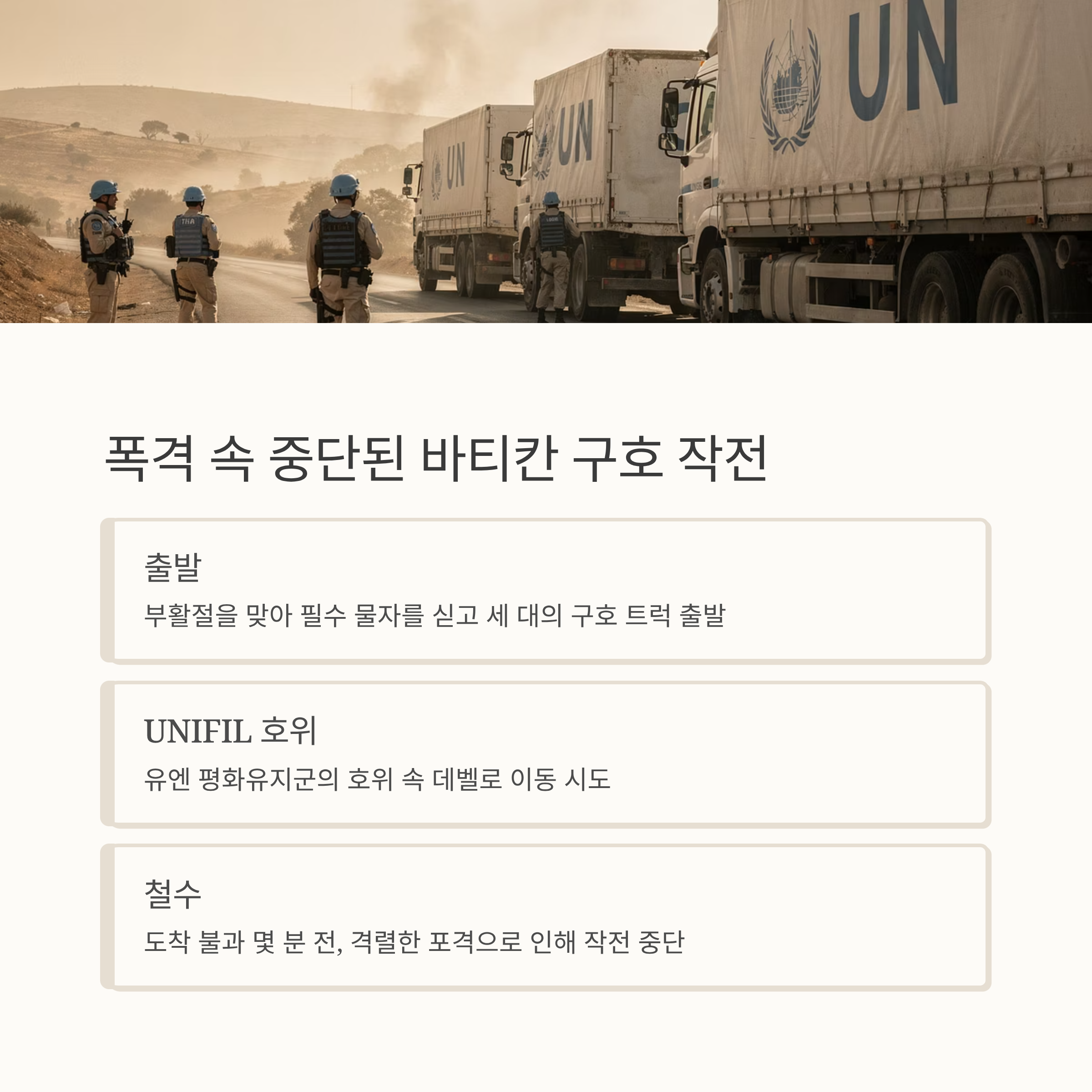 바티칸이 조직한 세 대의 구호 트럭은 부활절을 맞아 데벨 주민들에게 필수 물자를 전달하기 위해 출발했지만, 도착을 불과 몇 분 앞두고 격렬한 포격으로 인해 철수할 수밖에 없었습니다. 이번 작전은 UNIFIL의 호위를 받았으나, 인근 지역의 지속적인 포격으로 안전이 확보되지 못했습니다.