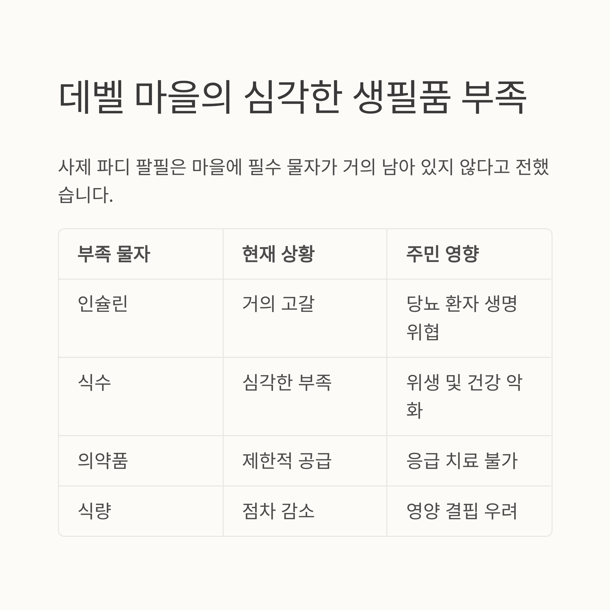 부족 물자현재 상황주민 영향