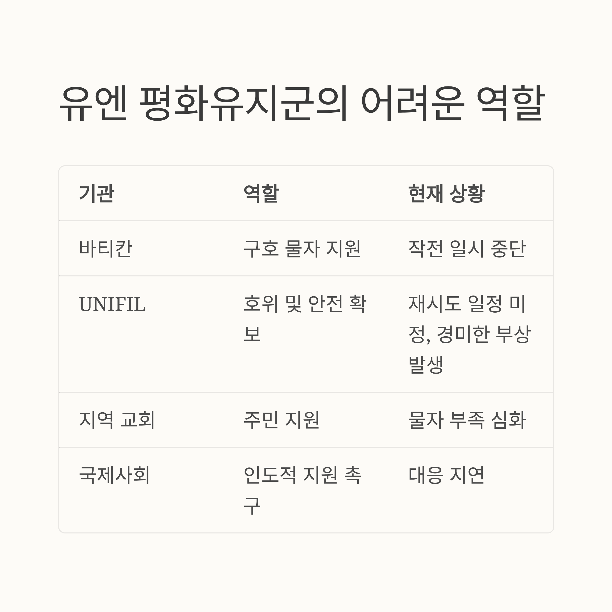UNIFIL은 구호 차량의 안전한 이동을 지원했지만, 예기치 못한 포격으로 인해 임무를 중단해야 했습니다. 이 과정에서 일부 평화유지군이 경미한 부상을 입었으며, 현재로서는 재시도 일정이 정해지지 않은 상태입니다.