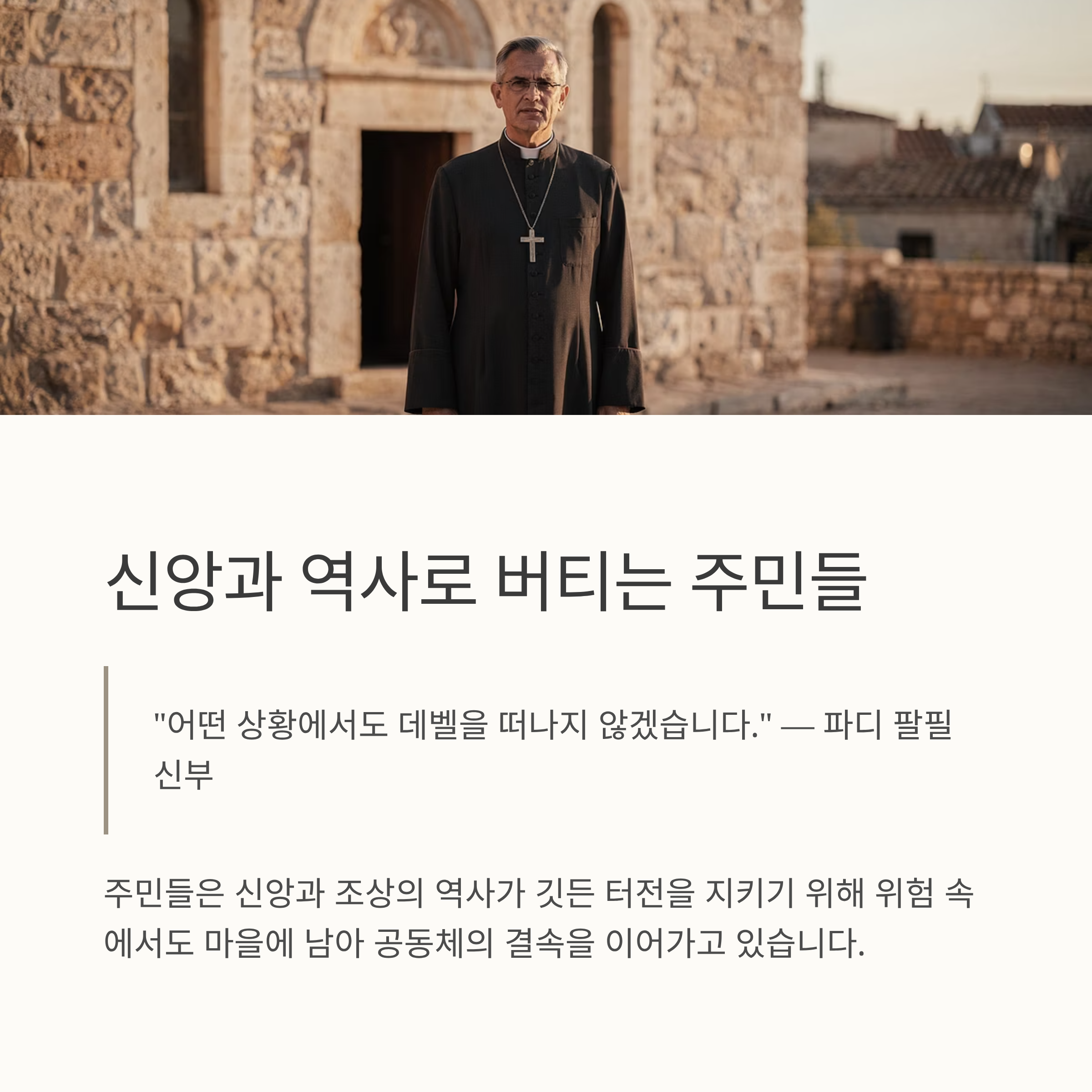 파디 팔필 신부는 어떤 상황에서도 데벨을 떠나지 않겠다는 강한 의지를 밝혔습니다. 주민들은 단순한 거주지가 아닌, 신앙과 조상의 역사가 깃든 터전을 지키기 위해 위험 속에서도 마을에 남아 있습니다. 이러한 결단은 공동체의 결속력을 보여주는 동시에 국제사회의 관심과 지원을 절실히 요구하고 있습니다.