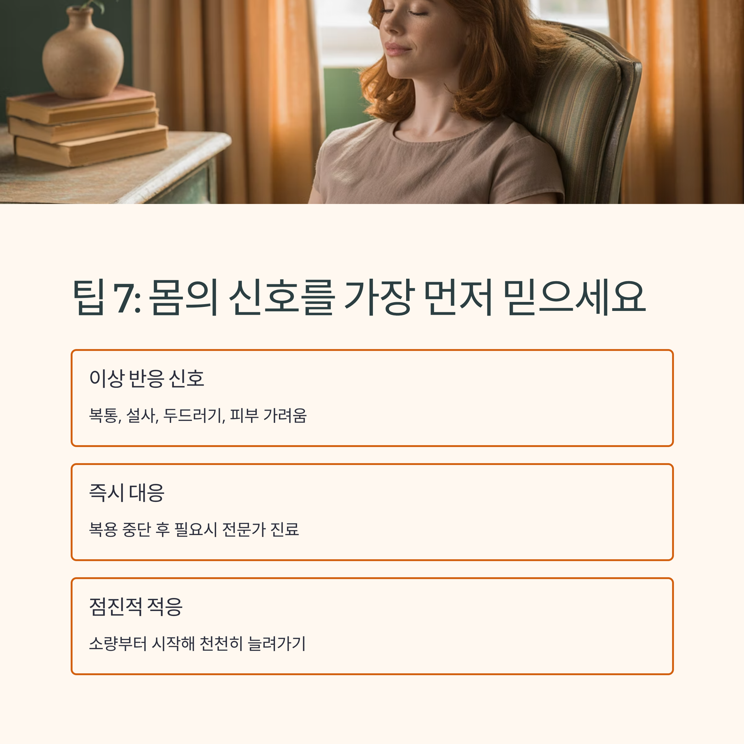 복용 후 복통, 설사, 두드러기, 피부 가려움 같은 이상 반응이 생긴다면 즉시 복용을 중단하세요. 필요하다면 전문가의 진료를 받는 것이 안전합니다. 또한 처음에는 소량으로 시작해 천천히 적응하는 것도 좋은 방법입니다.